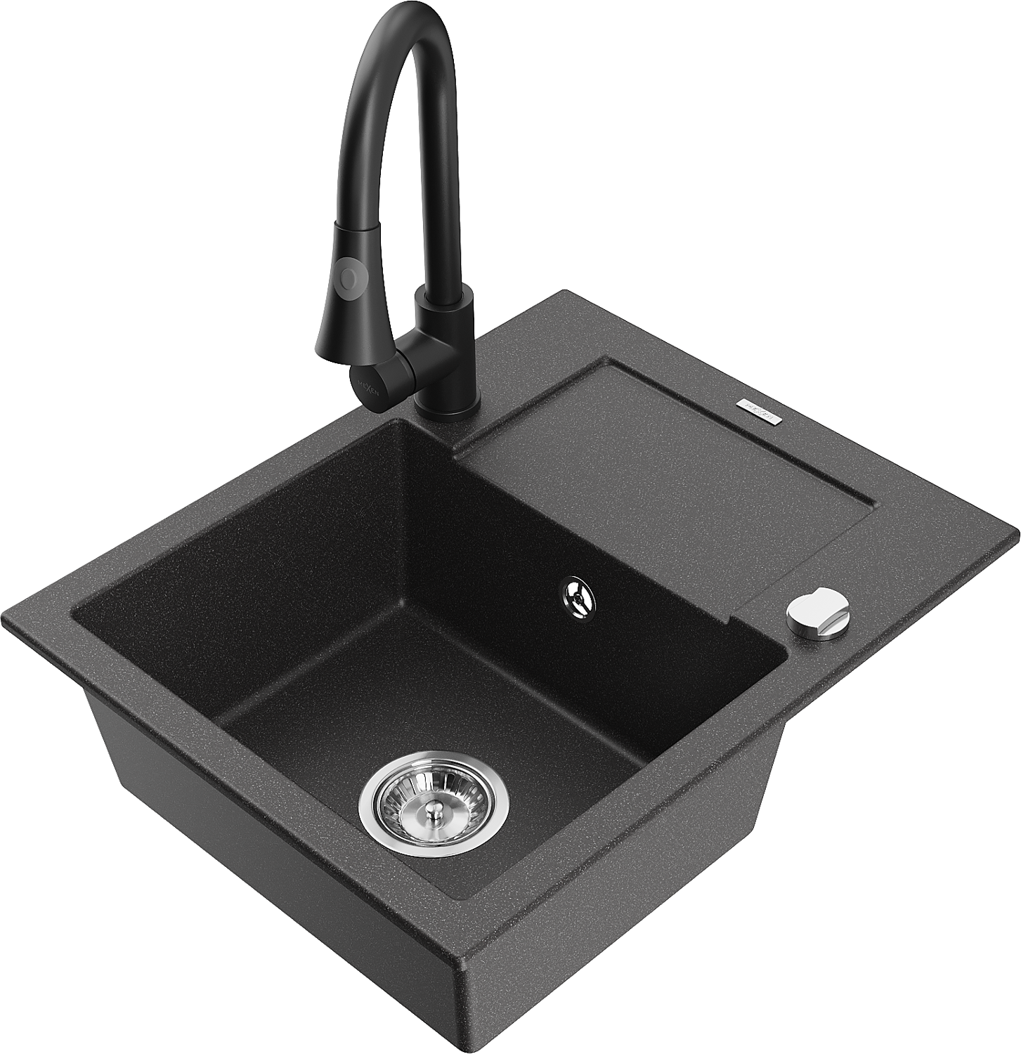 Mexen Enzo lavello da cucina in granito a 1 vasca con scolapiatti e rubinetto cucina Elia, nero maculato - 6506-76-670101-70