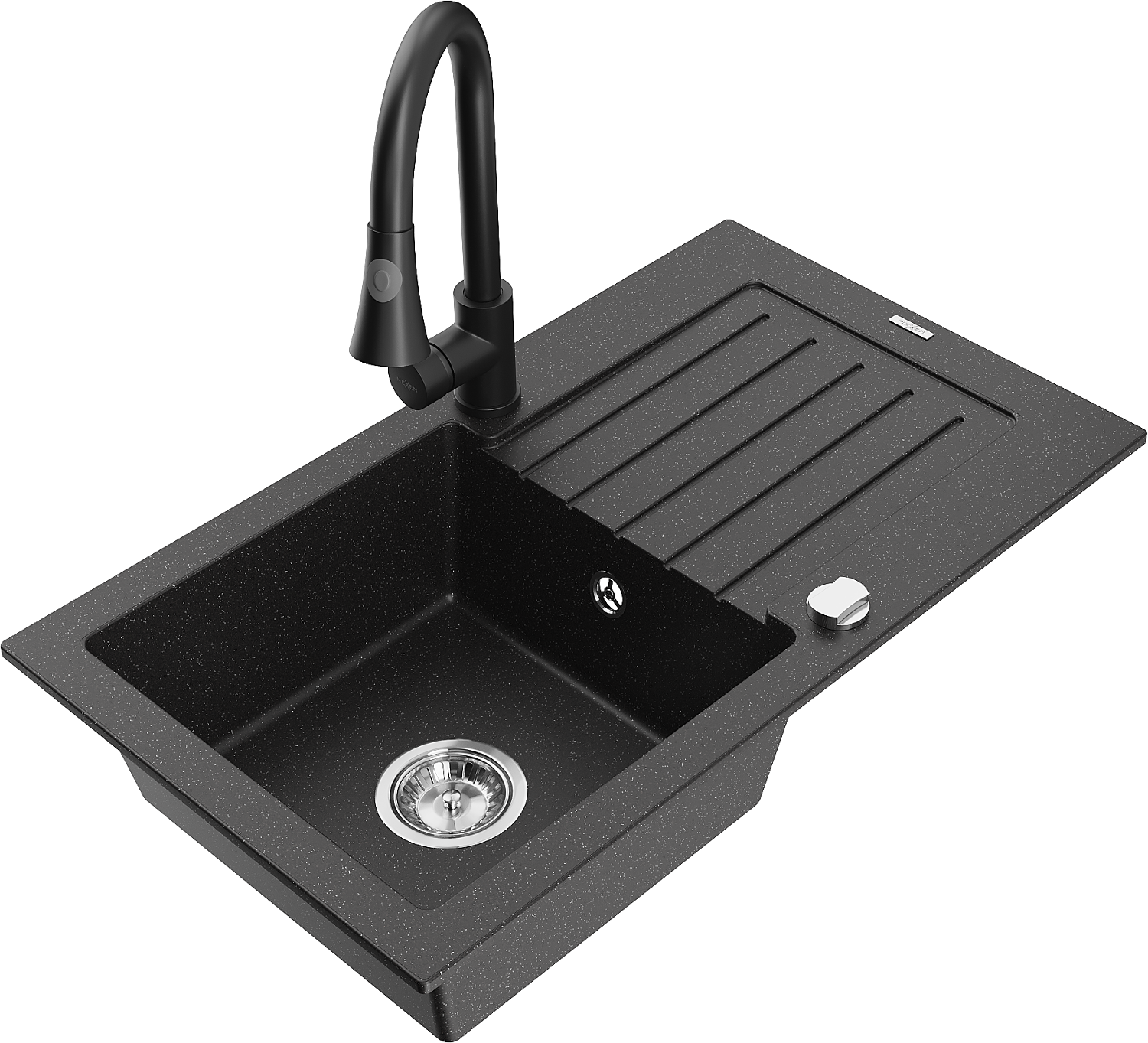 Mexen Pablo lavello in granito a 1 vasca con scolapiatti e rubinetto da cucina Elia, nero/metallo argento - 6510-73-670101-70