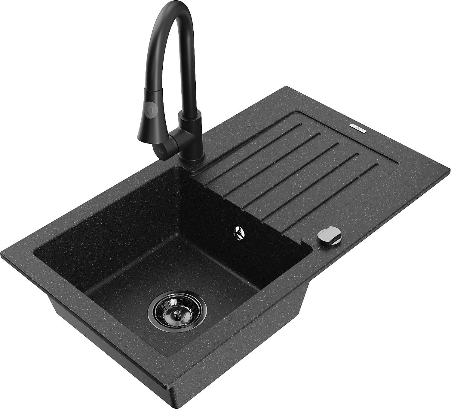 Mexen Pablo lavello in granito a 1 vasca con sgocciolatoio e rubinetto da cucina Elia, nero/argento metallizzato