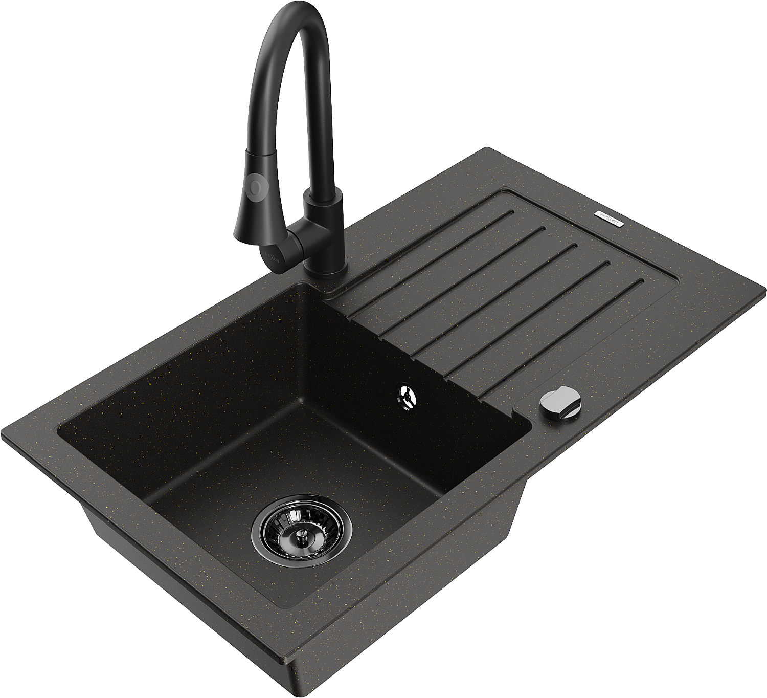 Mexen Pablo lavello in granito a 1 vasca con sgocciolatoio e rubinetto da cucina Elia, nero/oro metallizzato