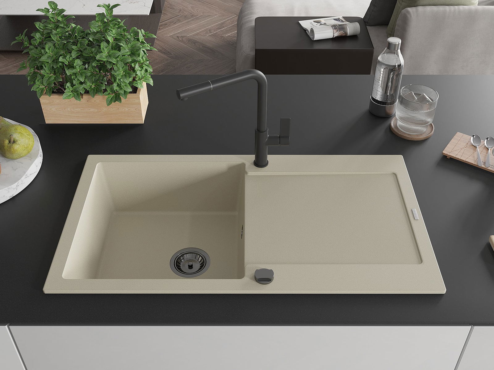 Il lavello è realizzato in granito di alta qualità. Rappresenta un complemento elegante e, soprattutto, pratico per ogni cucina, indipendentemente dal suo stile. L'alta qualità e la durata del granito garantiscono un utilizzo che dura per molti anni.