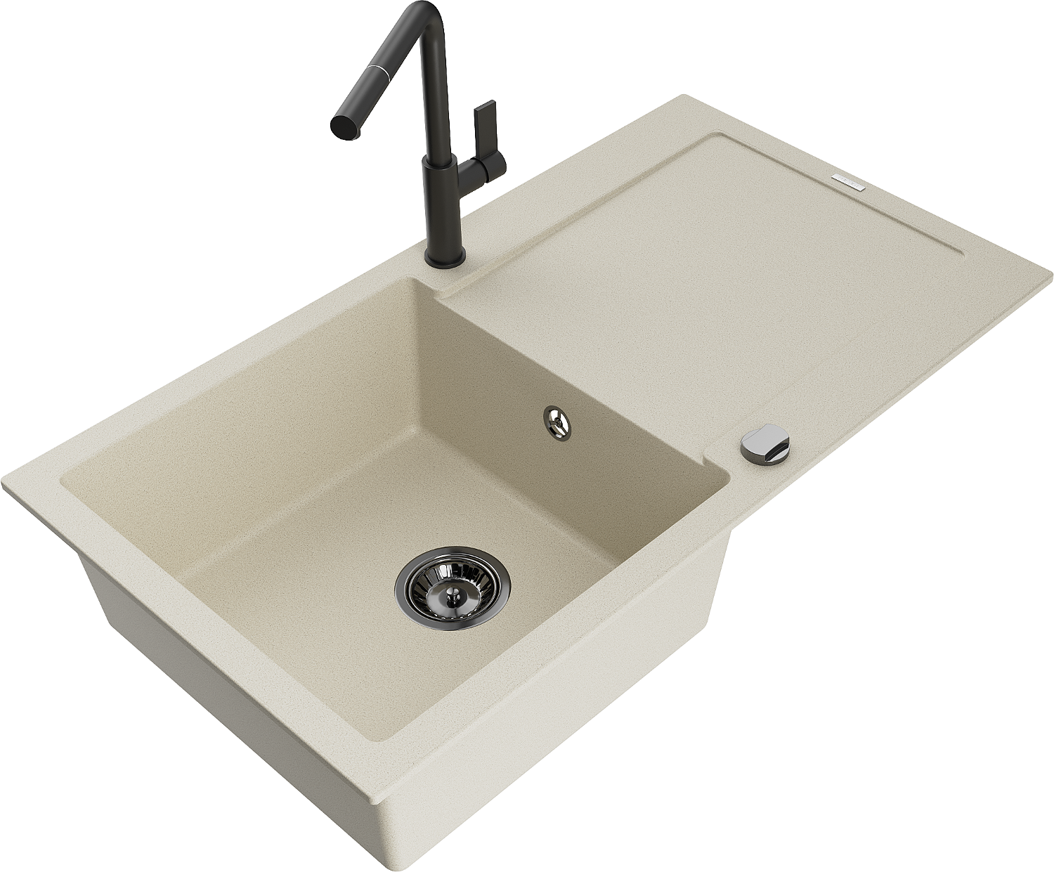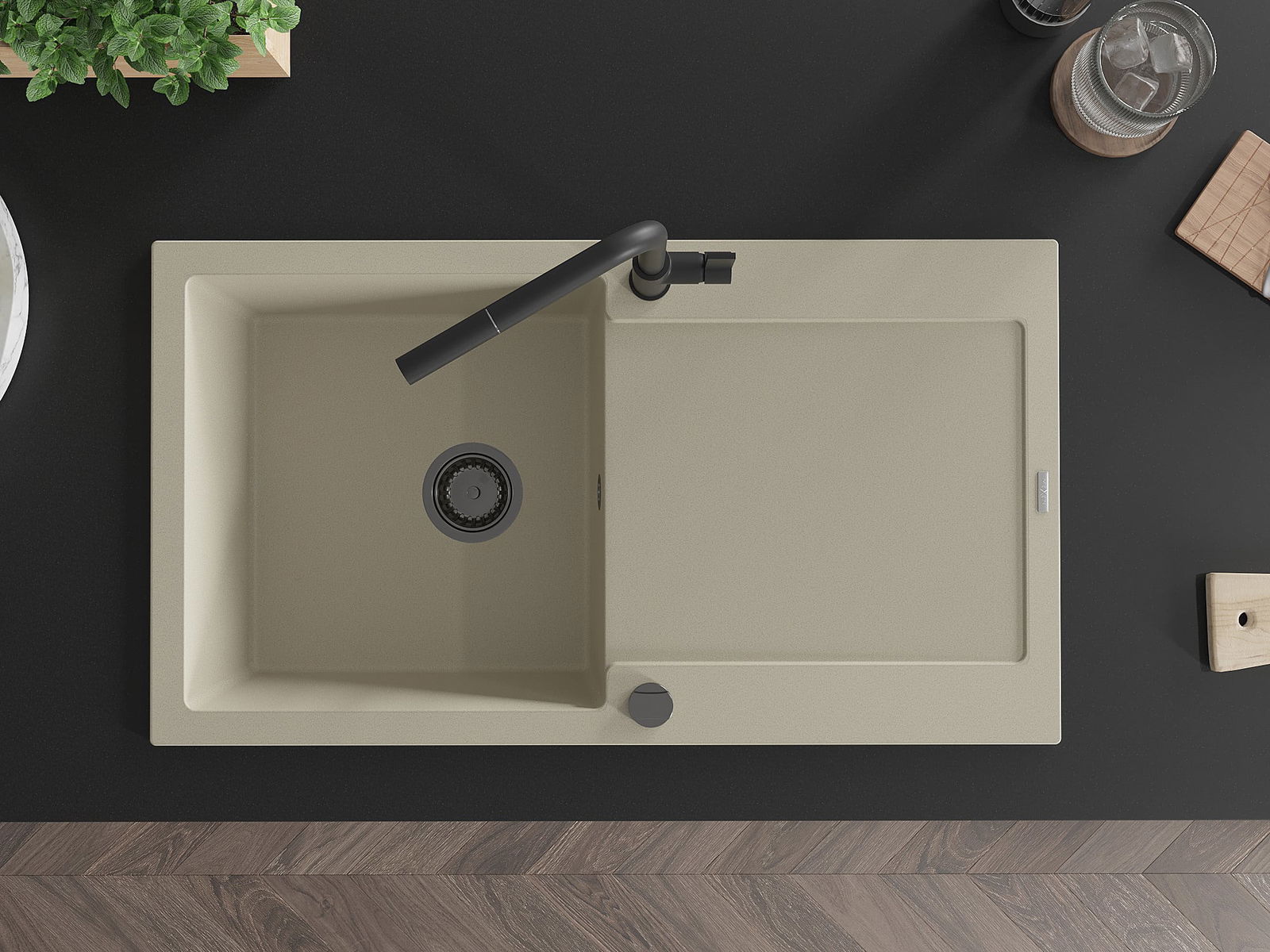 Mexen Leo lavello in granito 1-vasca con sgocciolatoio e rubinetto da cucina Flora, beige - 6501-69-670401-70-B