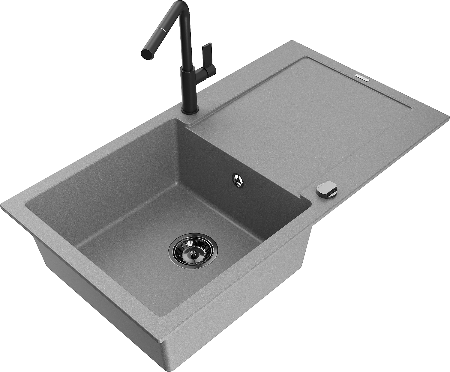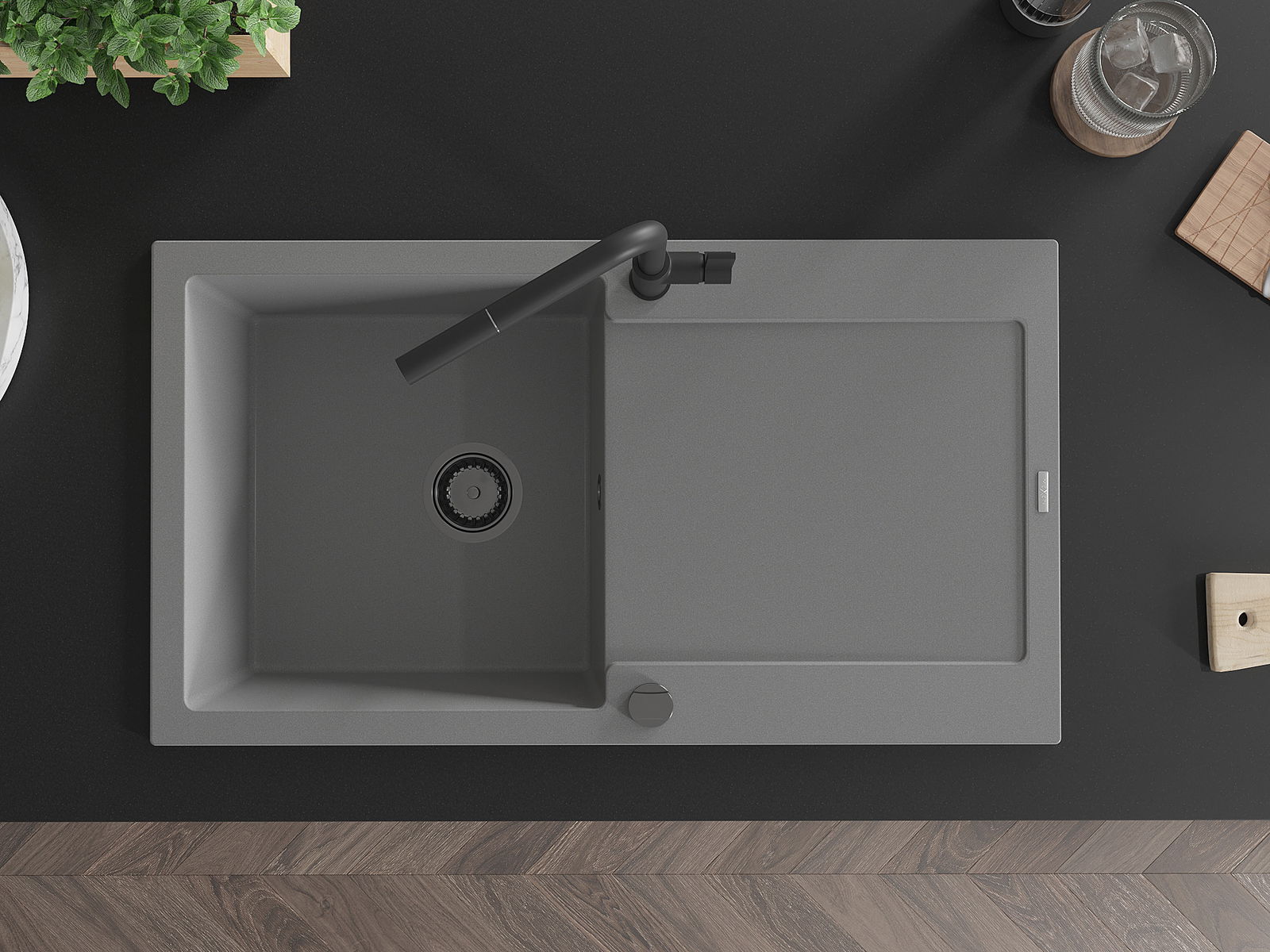 Mexen Leo lavello in granito a una vasca con sgocciolatoio e rubinetto da cucina Flora, grigio - 6501-71-670401-70-B