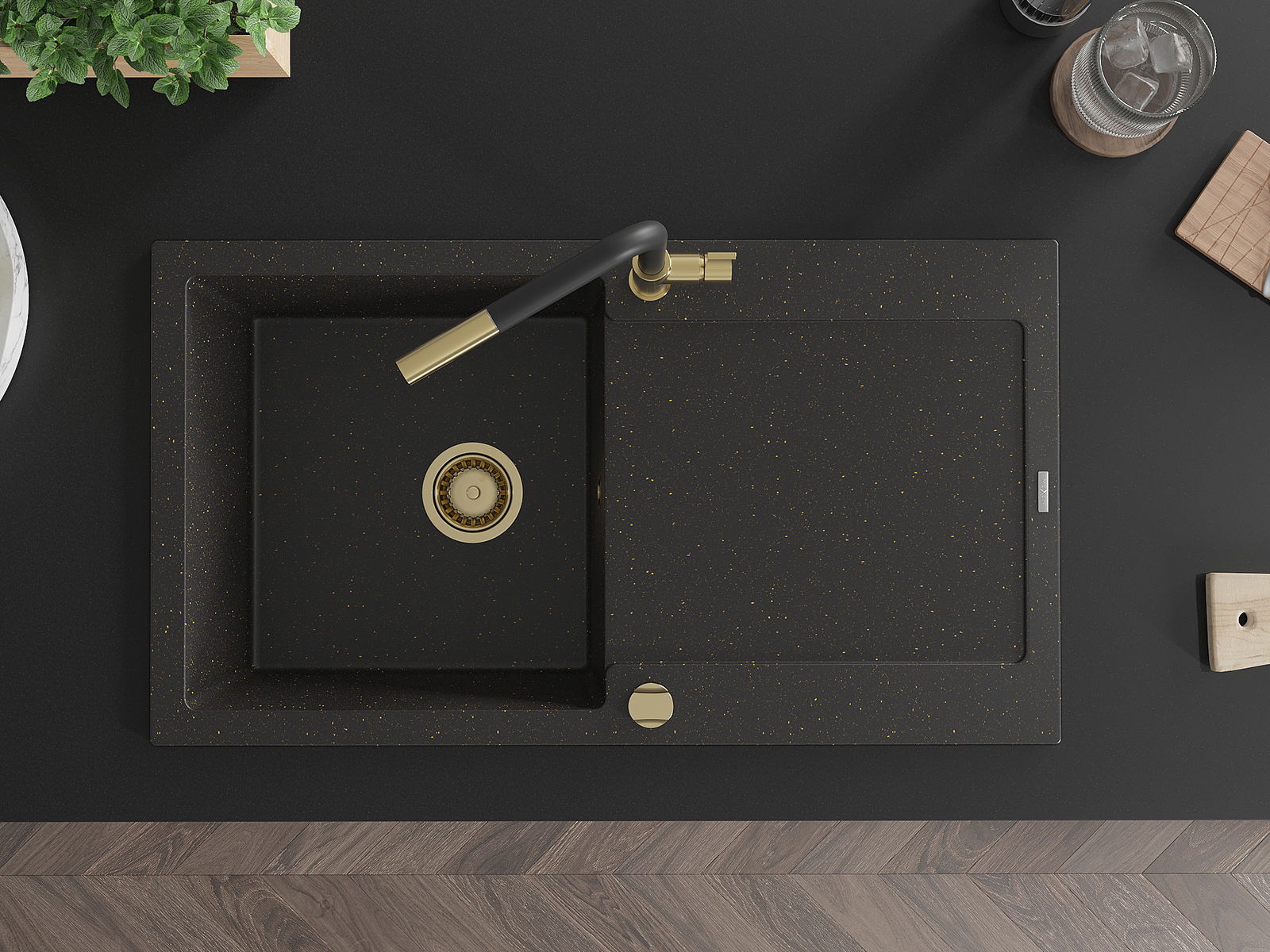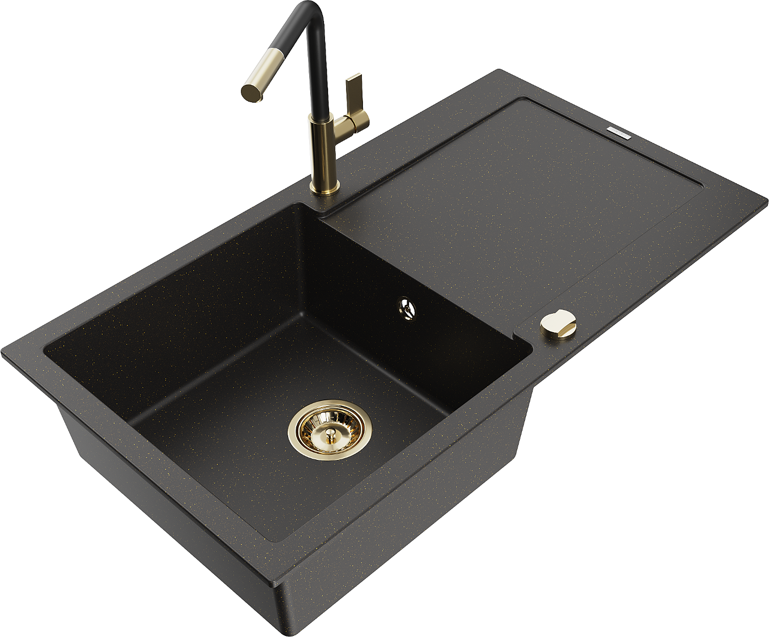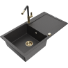 Mexen Leo lavello in granito a 1 vasca con sgocciolatoio e rubinetto cucina Flora, nero/oro metallizzato - 6501-75-670401-57-G