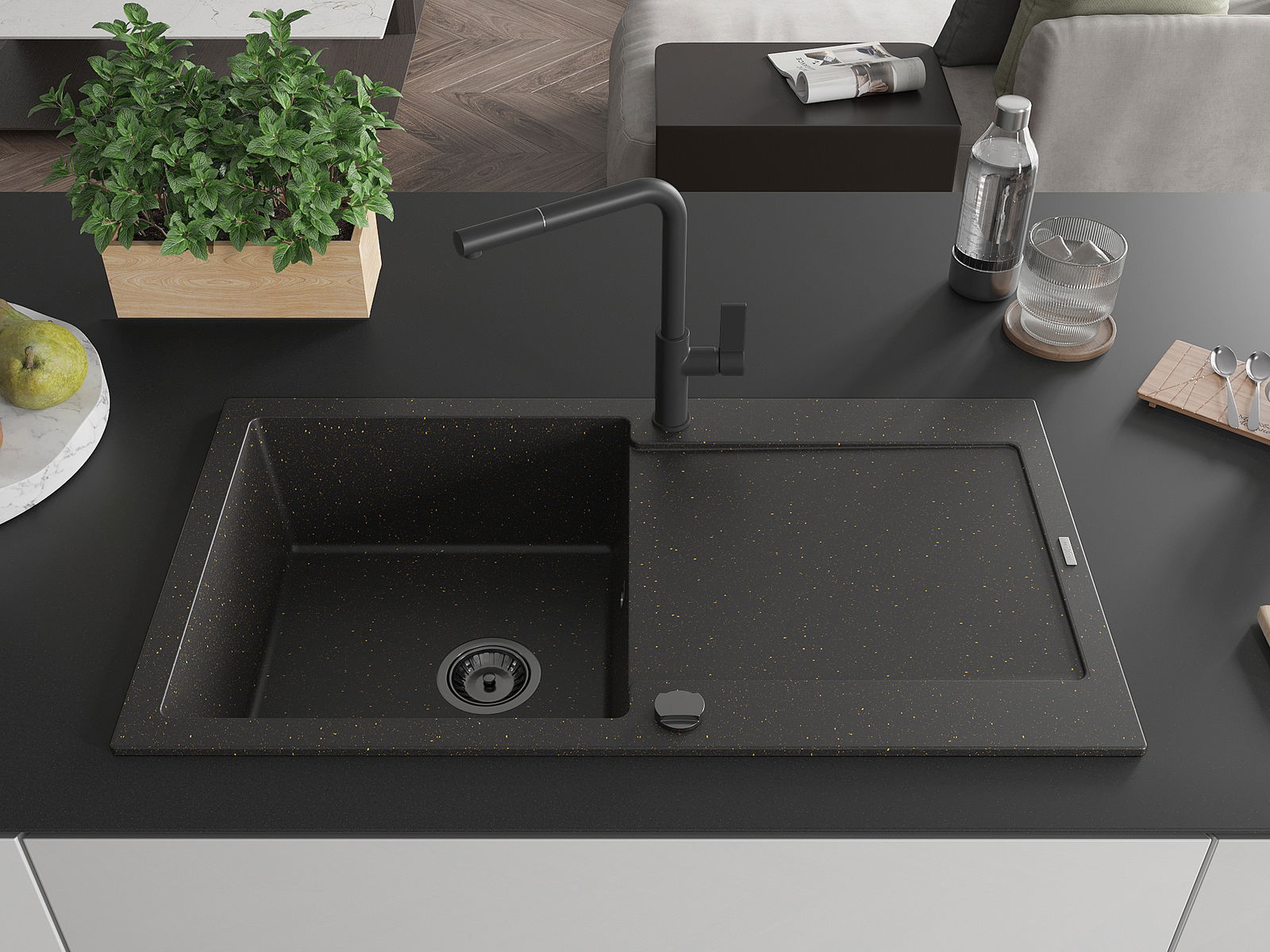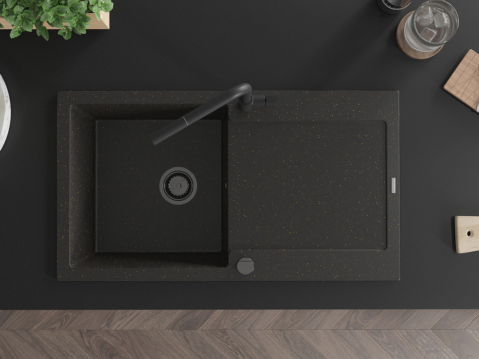 Mexen Leo lavello da cucina in granito, 1 vasca con gocciolatoio e miscelatore Flora, nero/oro metallico - 6501-75-670401-70-B