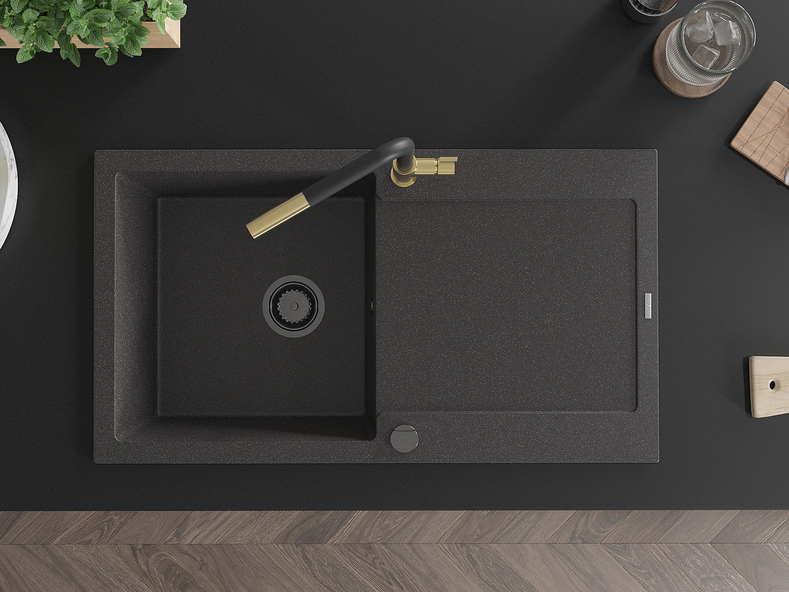 Mexen Leo lavello in granito a 1 vasca con gocciolatoio e rubinetto da cucina Flora, nero maculato - 6501-76-670401-57-B