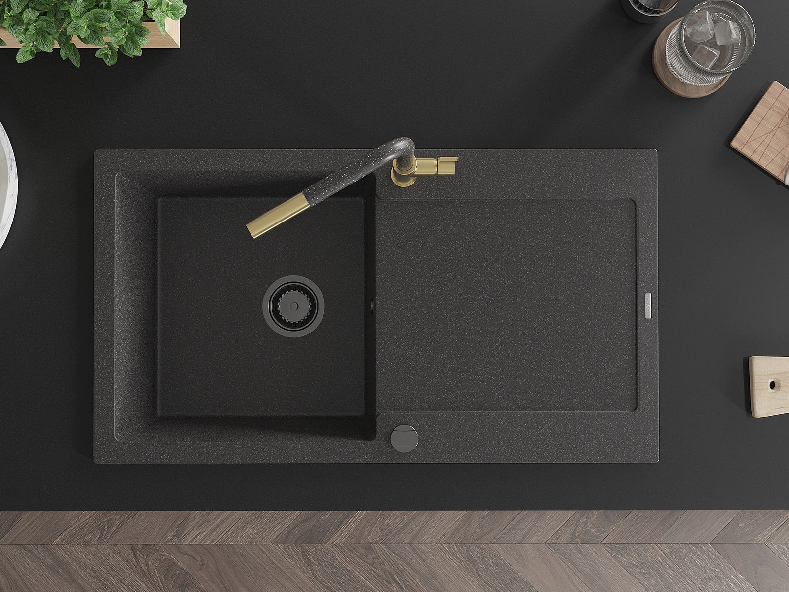 Mexen Leo lavello in granito a 1 vasca con gocciolatoio e rubinetto da cucina Flora, nero puntinato - 6501-76-670401-75-B