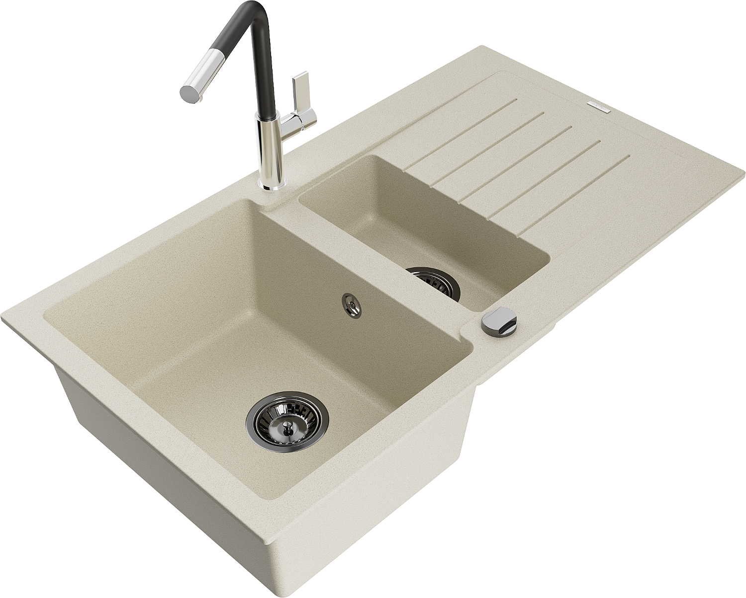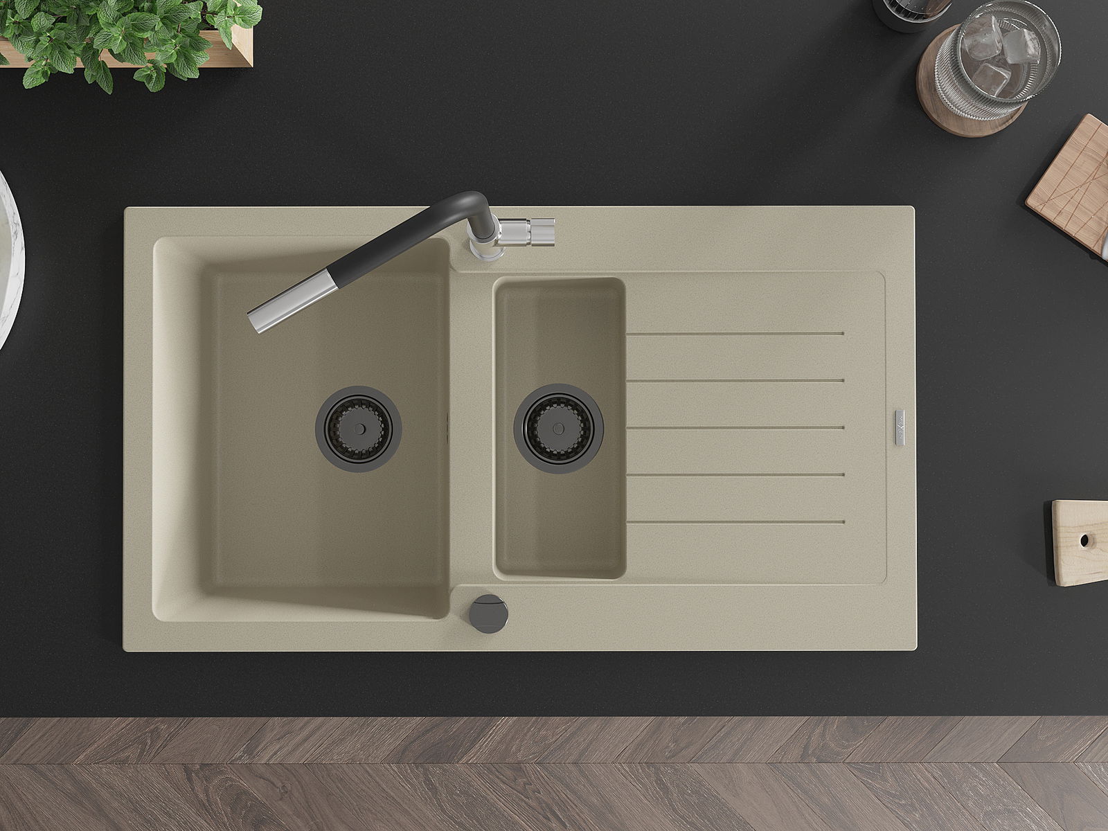 Mexen Matias lavello in granito 1,5 vasche con scolapiatti e rubinetto da cucina Flora, beige - 6502-69-670401-07-B