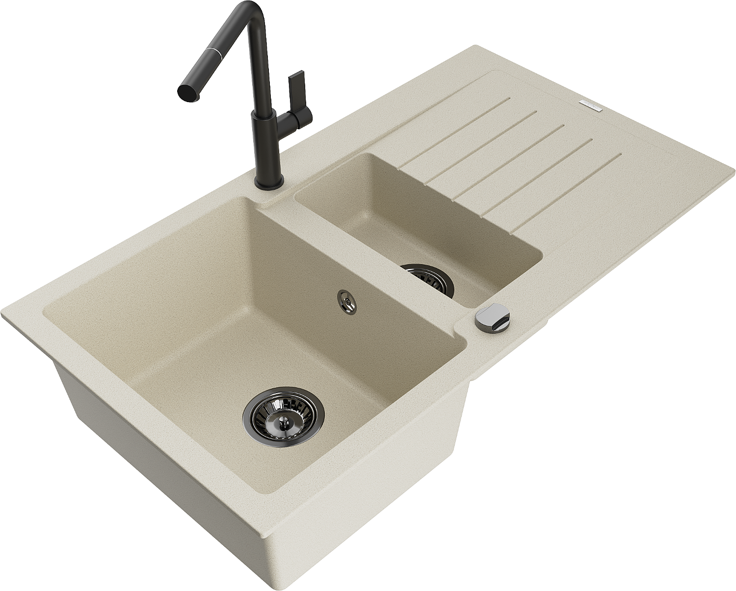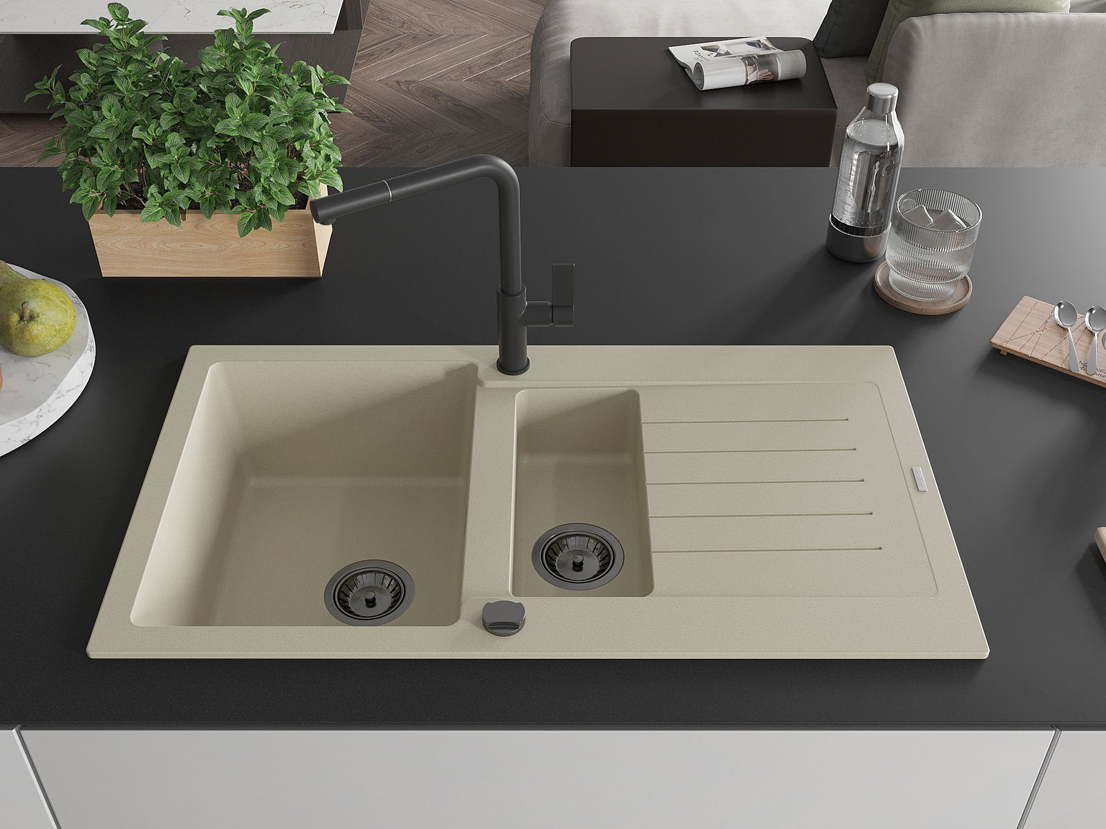 Mexen Matias lavello in granito 1,5 vasche con gocciolatoio e rubinetto da cucina Flora, beige - 6502-69-670401-70-B