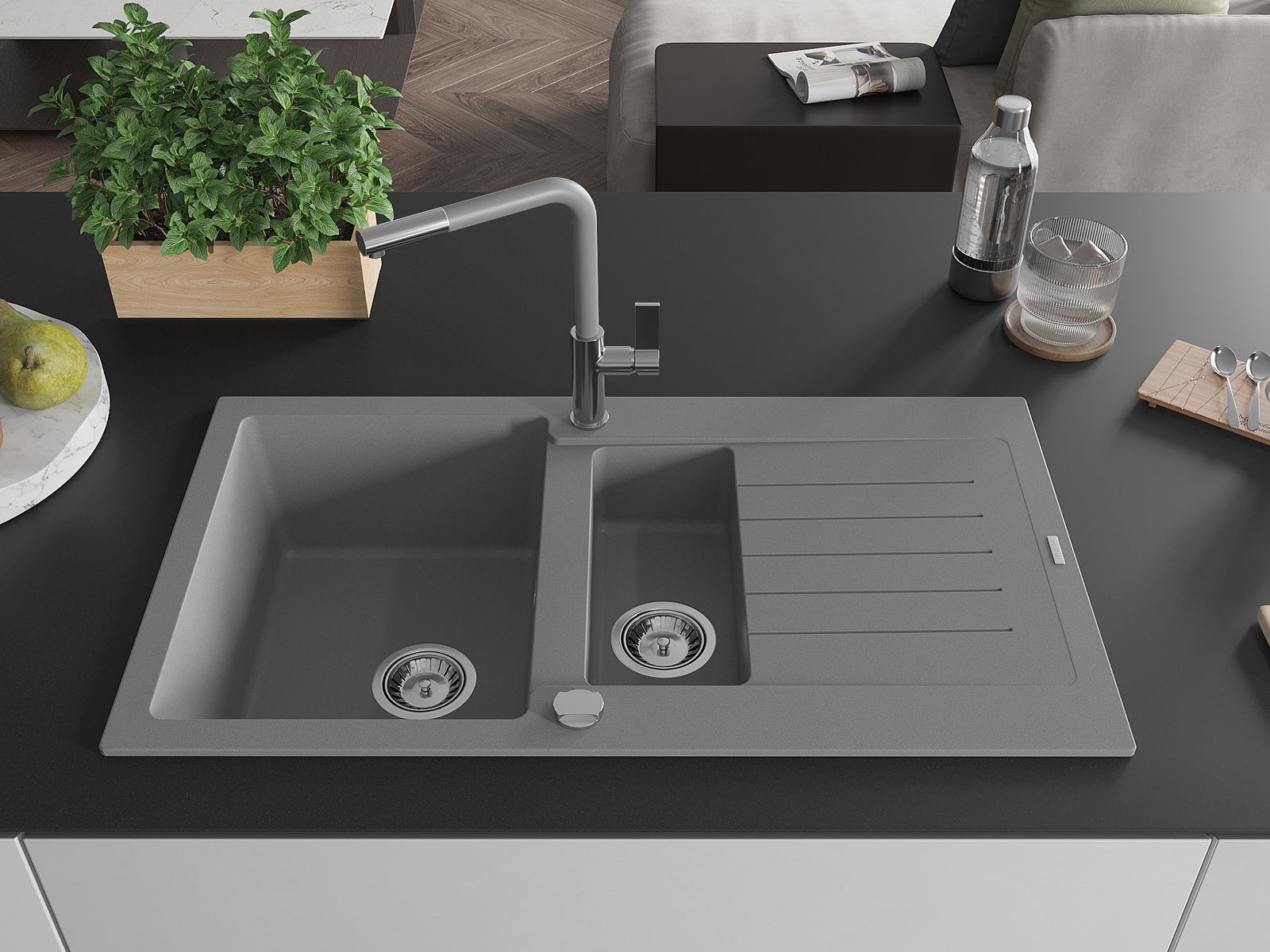 Mexen Matias lavello in granito 1,5 vasche con sgocciolatoio e rubinetto da cucina Flora, grigio - 6502-71-670401-06