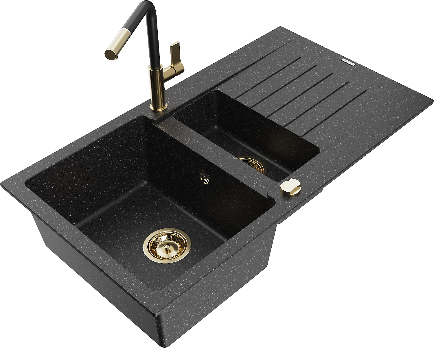 Mexen Matias lavello in granito 1,5 vasche con sgocciolatoio e rubinetto cucina Flora, nero/argento - 6502-73-670401-57-G