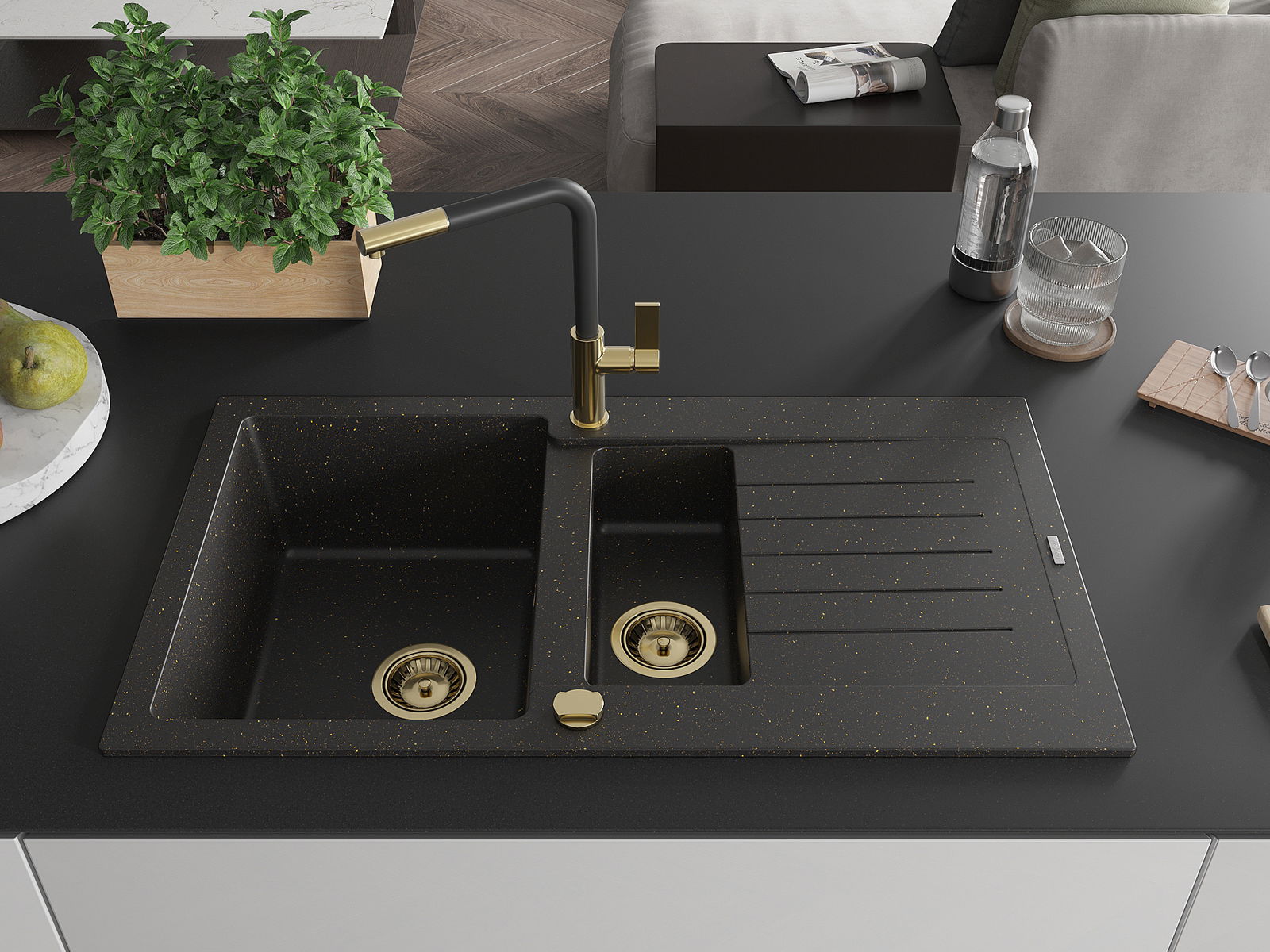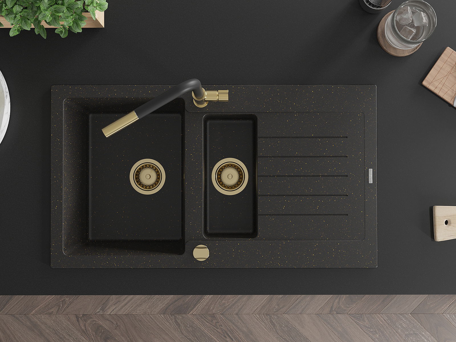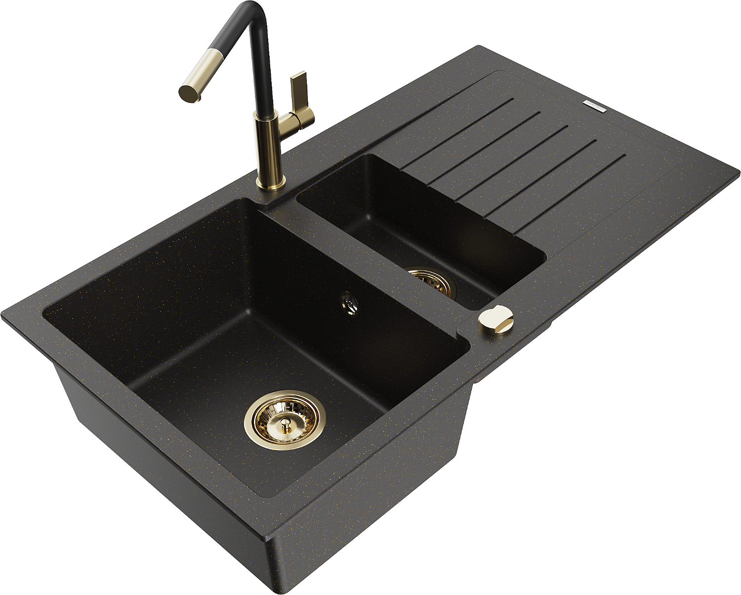 Mexen Matias lavello granitico 1,5 vasca con scolapiatti e miscelatore cucina Flora, nero/oro - 6502-75-670401-57-G
