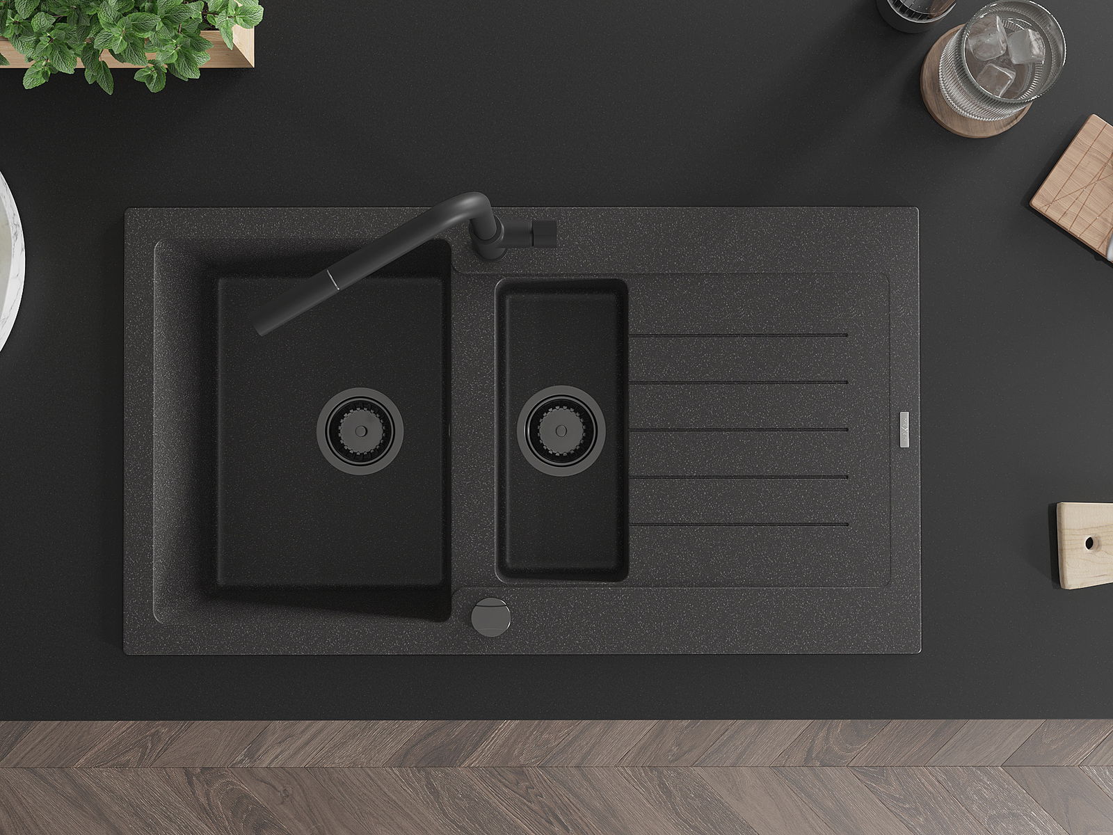 Mexen Matias lavello in granito 1,5 vasche con sgocciolatoio e miscelatore cucina Flora, nero maculato - 6502-76-670401-70-B
