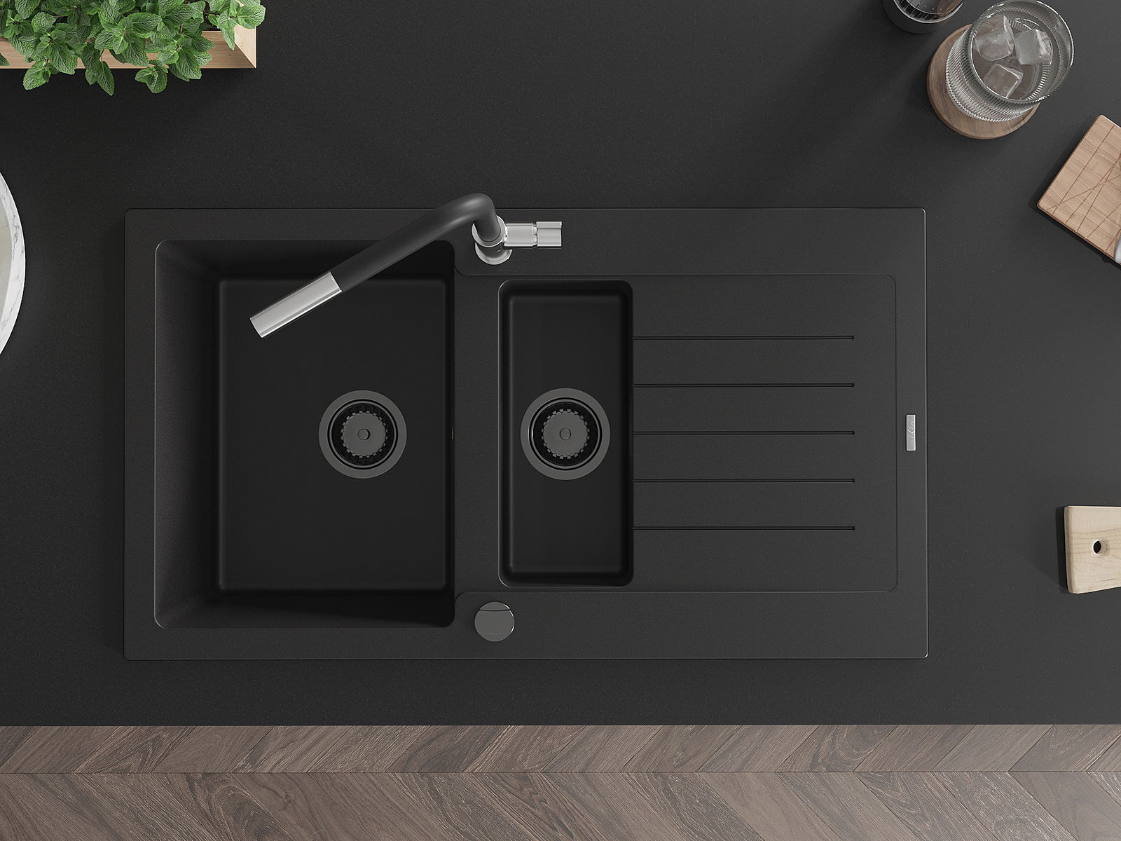 Mexen Matias lavello da cucina in granito 1,5 vasche con scolapiatti e rubinetto Flora, nero - 6502-77-670401-07-B