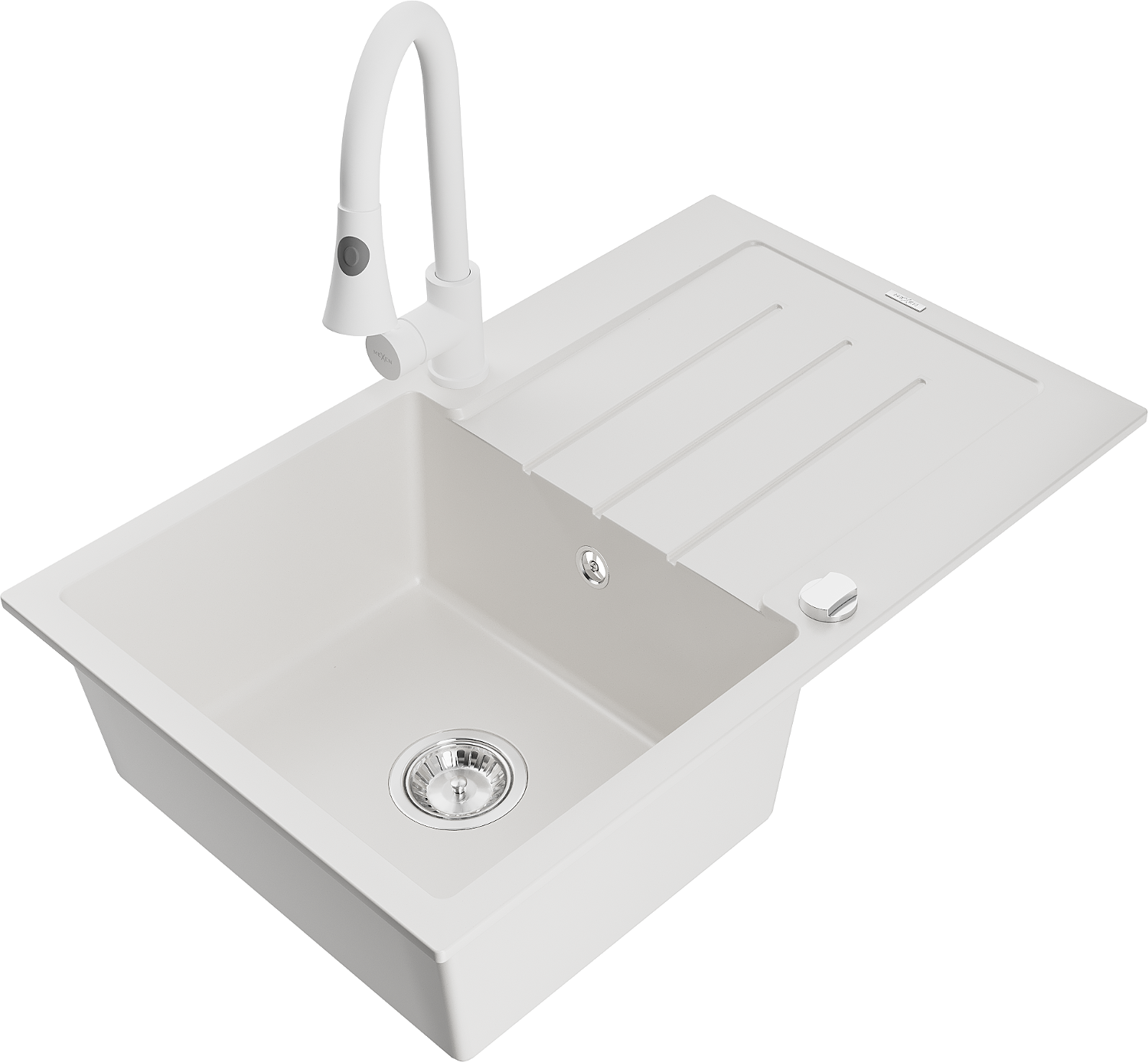 Mexen Bruno lavello da cucina in granito a 1 vasca con scolapiatti e rubinetto da cucina Elia, bianco - 6513-20-670101-20