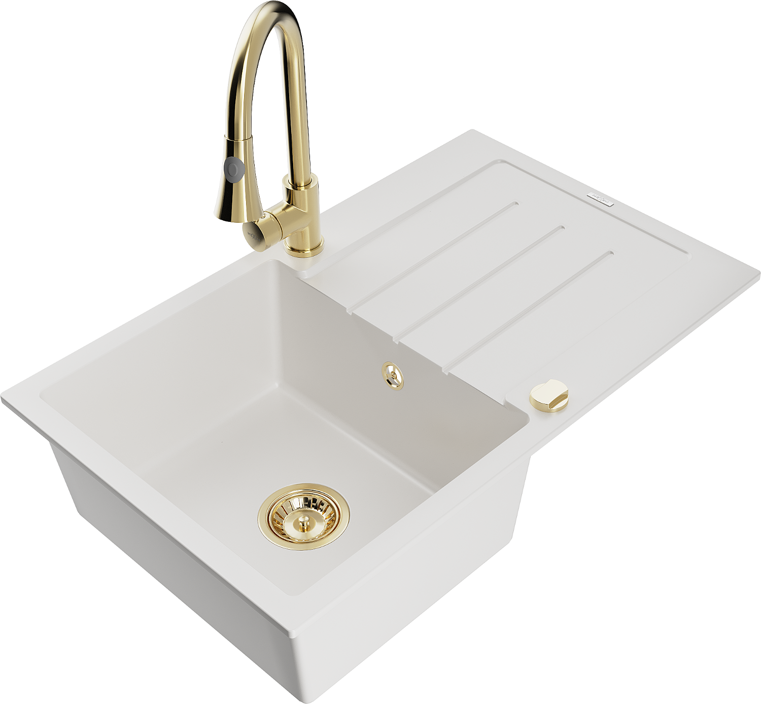 Mexen Bruno lavello da cucina in granito con 1 vasca e sgocciolatoio e miscelatore Elia, bianco - 6513-20-670101-50