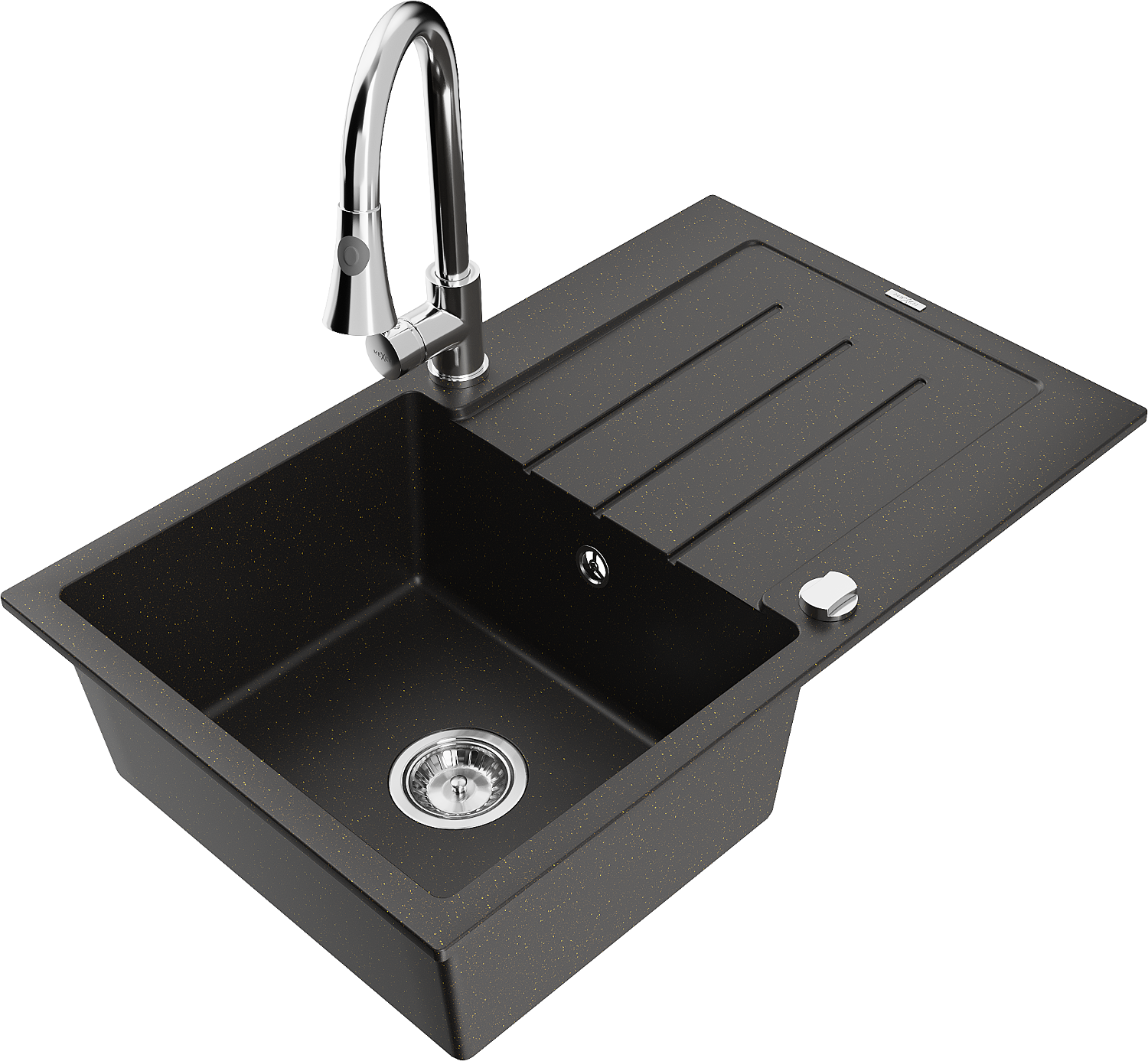 Mexen Bruno lavello in granito a 1 vasca con scolapiatti e rubinetto da cucina Elia, nero/oro metallizzato - 6513-75-670101-00