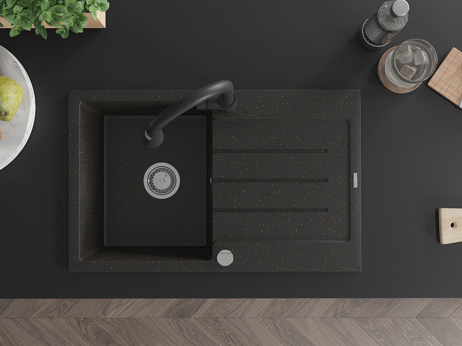 Mexen Bruno lavello in granito a 1 vasca con sgocciolatoio e rubinetto da cucina Elia, nero/oro metallizzato - 6513-75-670101-70