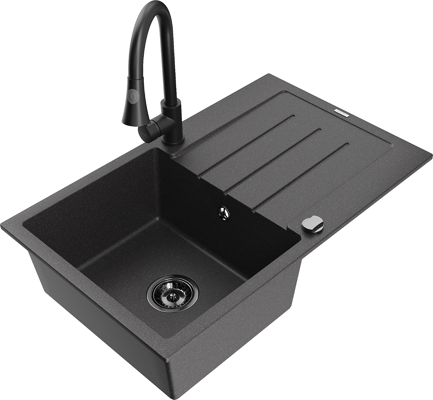 Mexen Bruno lavello in granito a 1 vasca con sgocciolatoio e rubinetto da cucina Elia, nero maculato - 6513-76-670101-70-B