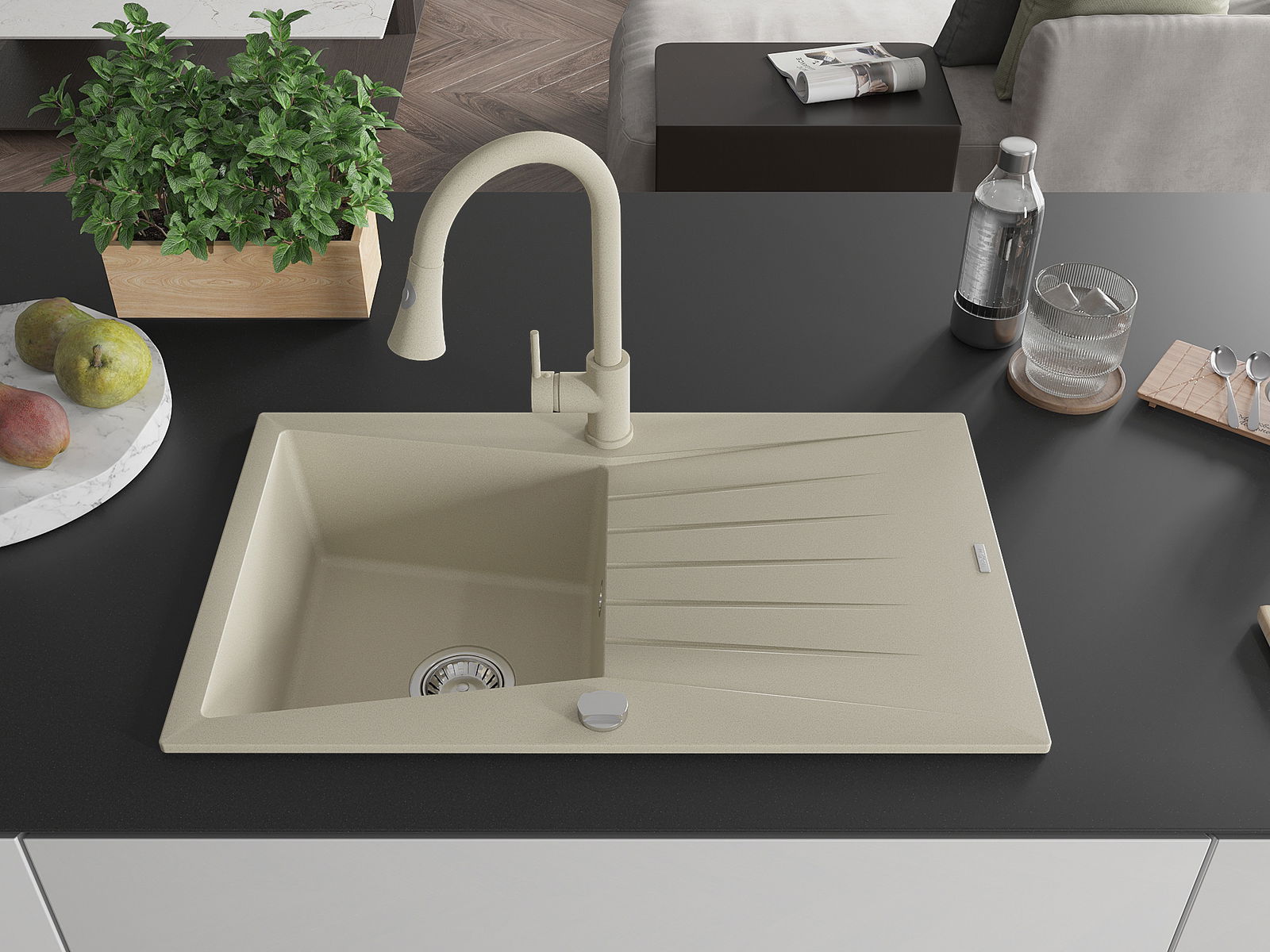 Mexen Cesar lavello in granito ad 1 vasca con scolapiatti e rubinetto da cucina Elia, beige - 6514-69-670101-69