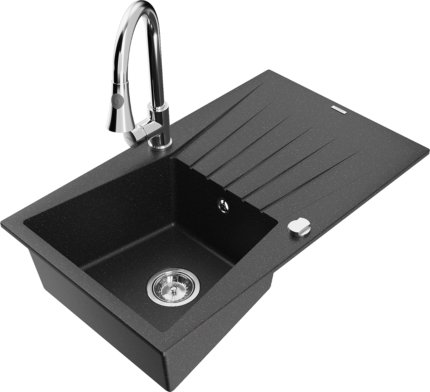 Mexen Cesar lavello in granito a 1 vasca con gocciolatoio e rubinetto da cucina Elia, nero/argento metallizzato