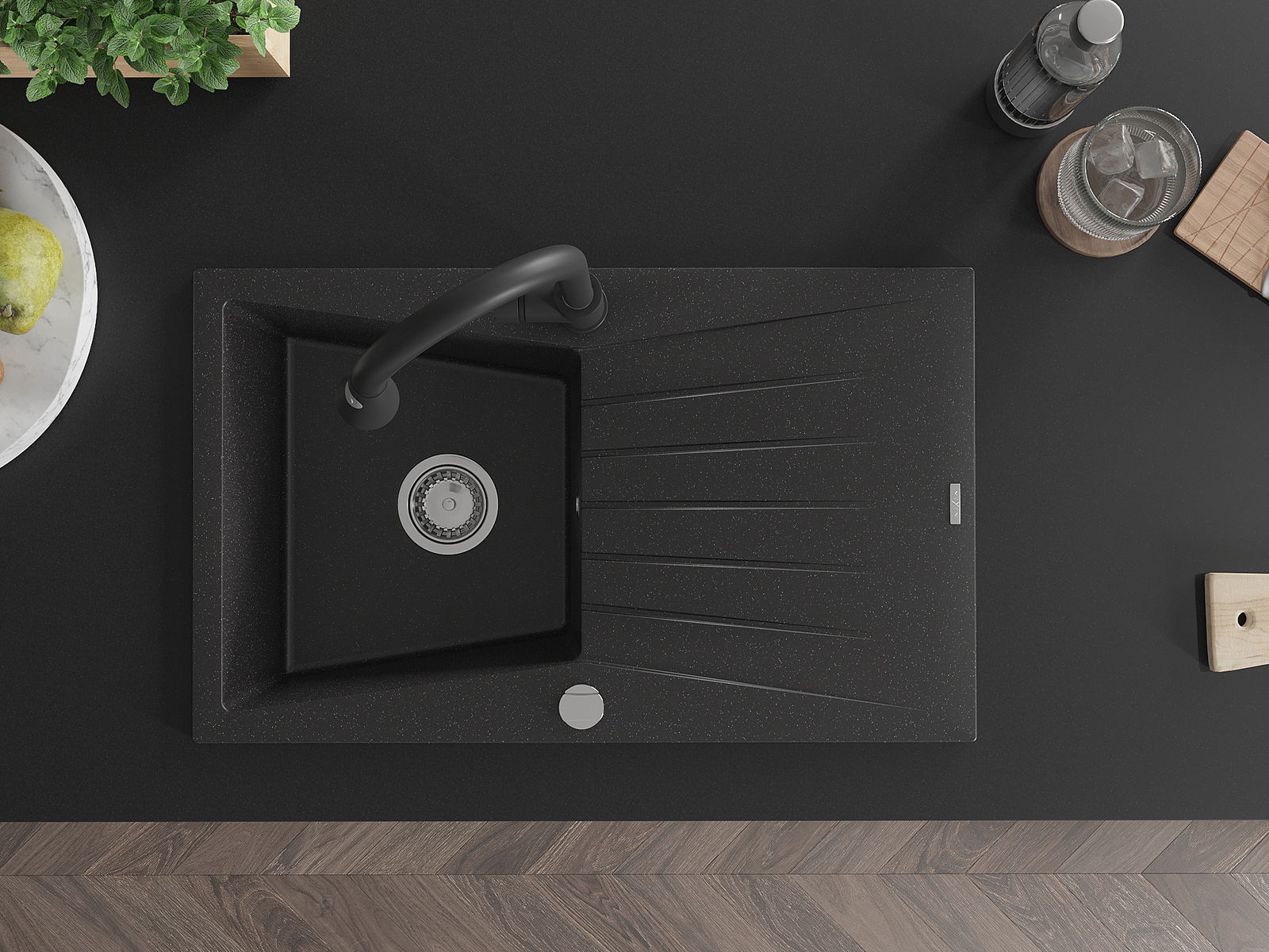 Mexen Cesar lavello in granito a 1 vasca con scolapiatti e rubinetto da cucina Elia, nero/argento metallizzato
