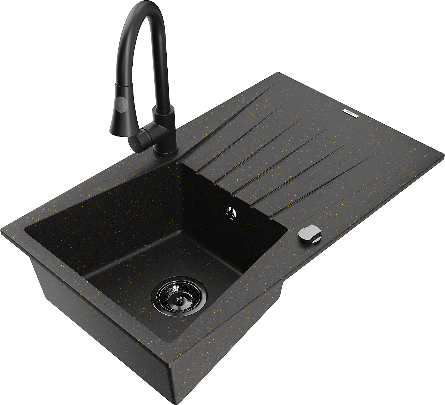 Mexen Cesar lavello in granito a una vasca con scolapiatti e rubinetto da cucina Elia, nero/oro metallizzato