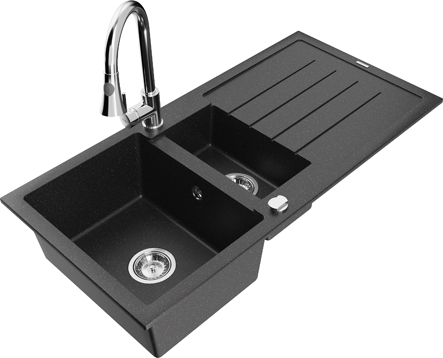 Mexen Andres lavello in granito a 1,5 vasche con scolapiatti e rubinetto da cucina Elia, nero/argento metallizzato