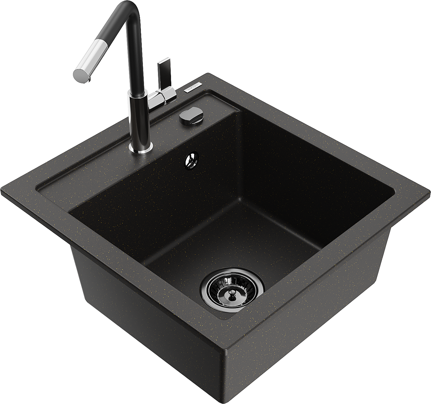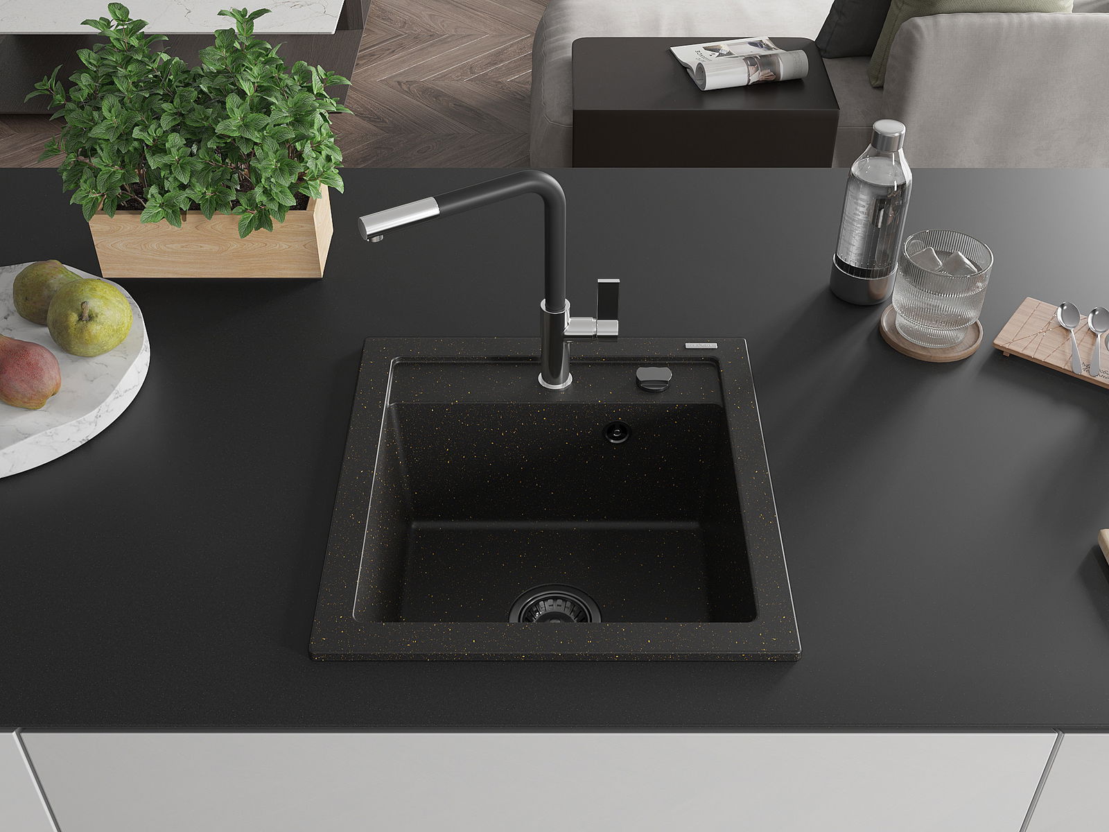 Mexen Vito lavello da cucina in granito con 1 vasca e rubinetto cucina Flora, nero/oro metallico - 6503-75-670401-07-B