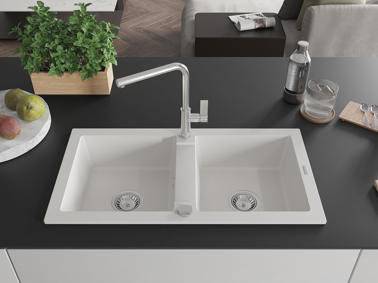 Mexen Mario lavello in granito a 2 vasche con miscelatore da cucina Flora, bianco - 6504-20-670401-00