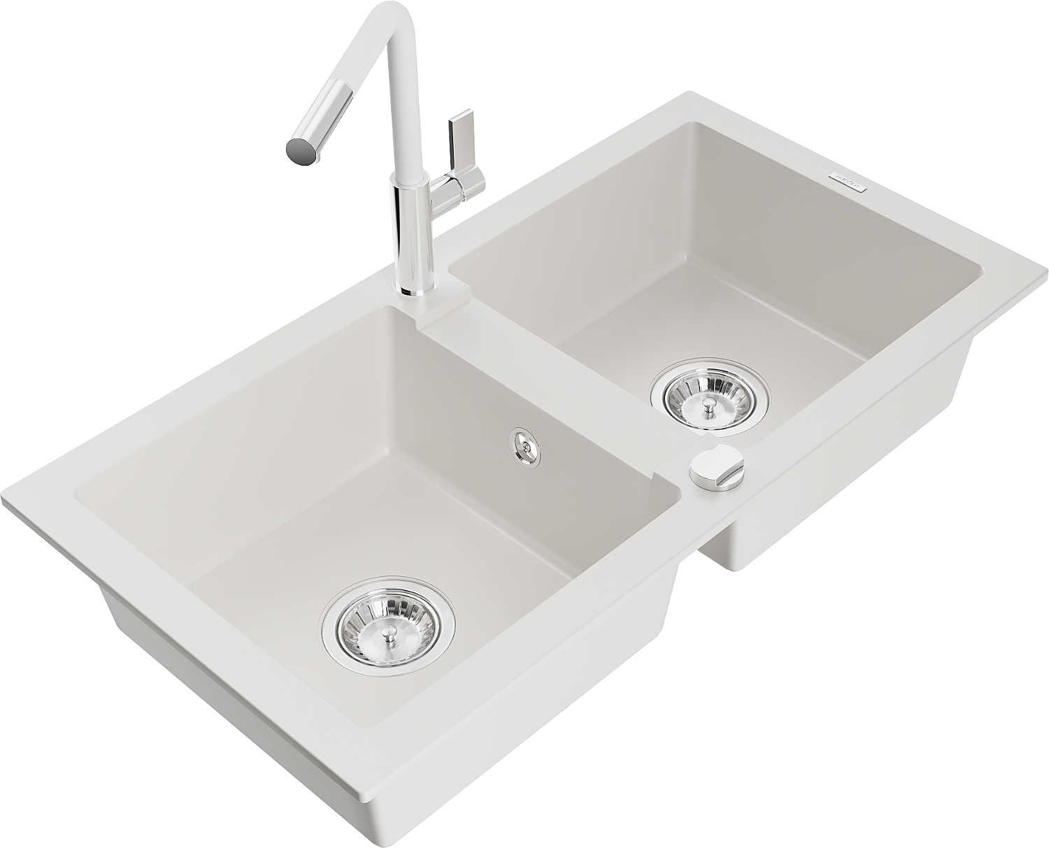 Mexen Mario lavello in granito a 2 vasche con rubinetto da cucina Flora, bianco - 6504-20-670401-02