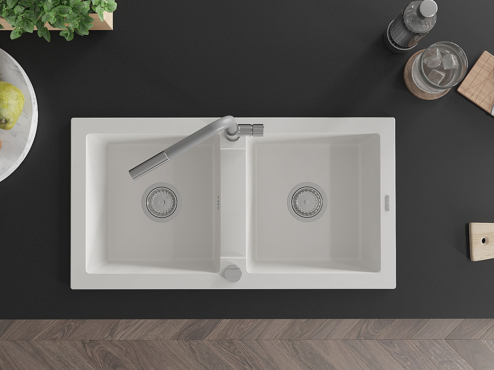 Mexen Mario lavello in granito a 2 vasche con rubinetto da cucina Flora, bianco - 6504-20-670401-06