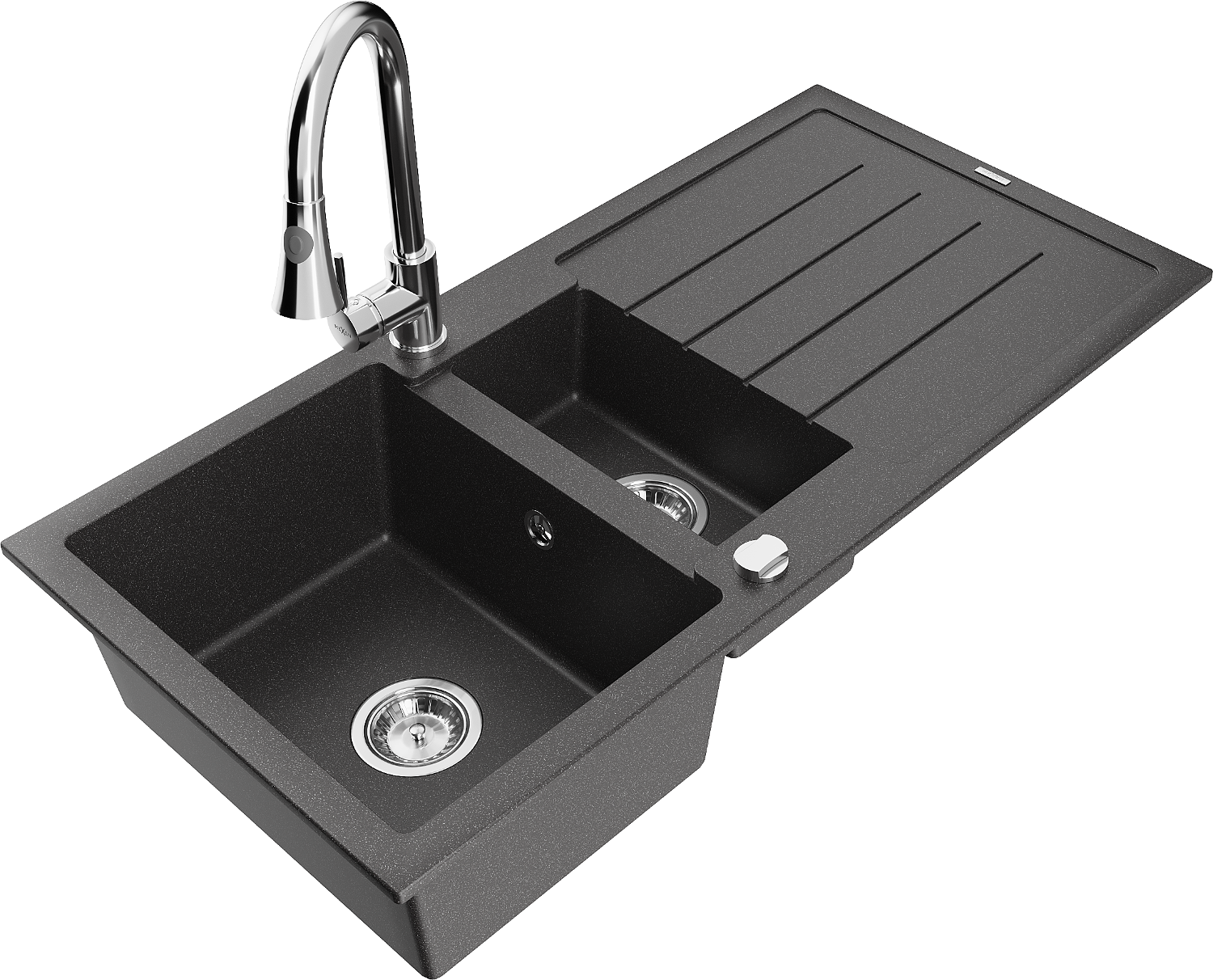 Mexen Andres lavello in granito 1,5 vasche con sgocciolatoio e rubinetto da cucina Elia, nero maculato - 6515-76-670101-00