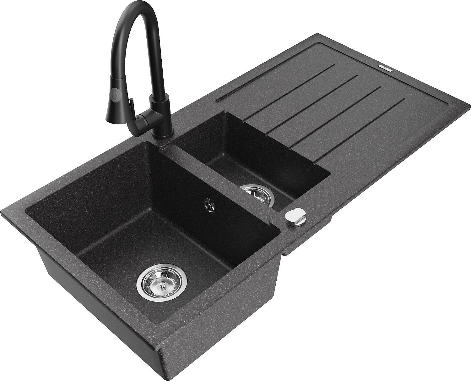 Mexen Andres lavello in granito 1,5 vasche con sgocciolatoio e rubinetto da cucina Elia, nero maculato - 6515-76-670101-70