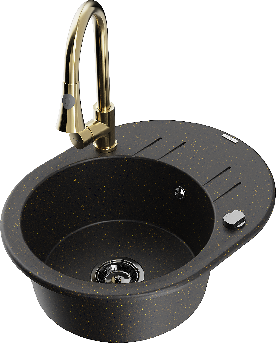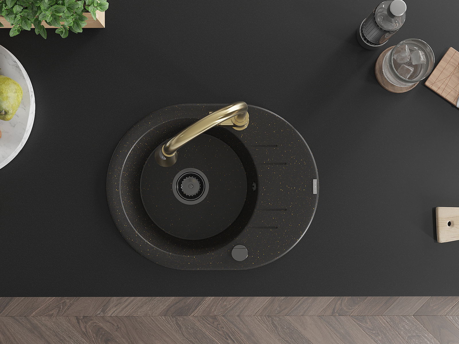 Mexen Kevin lavello in granito a 1 vasca con scolapiatti e rubinetto da cucina Elia, nero/oro metallico - 6517-75-670101-50-B