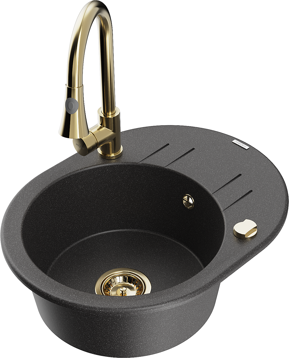 Mexen Kevin lavello in granito a 1 vasca con sgocciolatoio e rubinetto da cucina Elia, nero maculato - 6517-76-670101-50