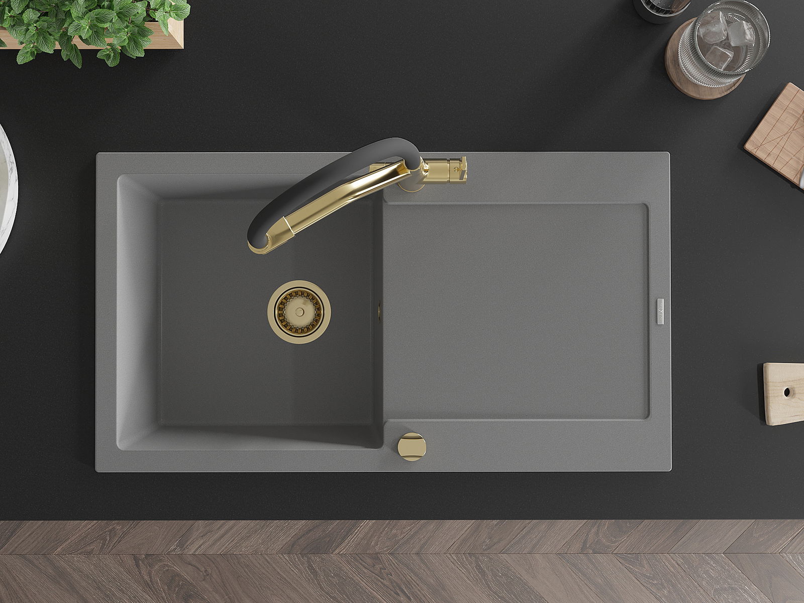 Mexen Leo lavello in granito a 1 vasca con sgocciolatoio e rubinetto da cucina Duo, grigio - 6501-71-671701-57-G