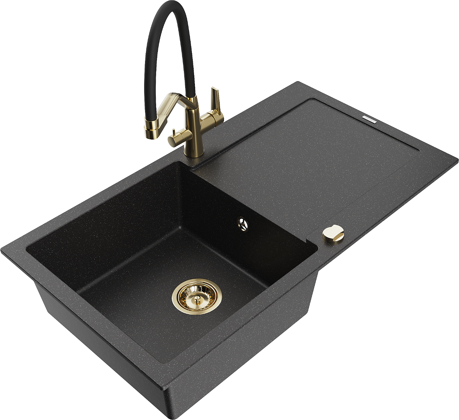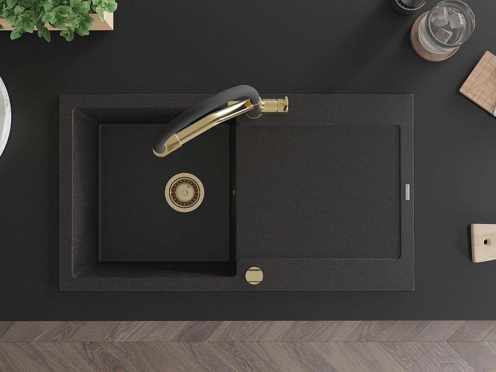 Mexen Leo lavello in granito a 1 vasca con scivolo e rubinetto da cucina Duo, nero/argento metallizzato - 6501-73-671701-57-G