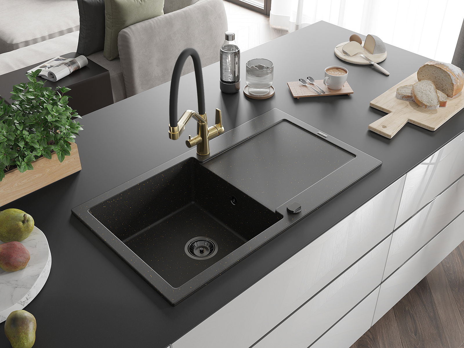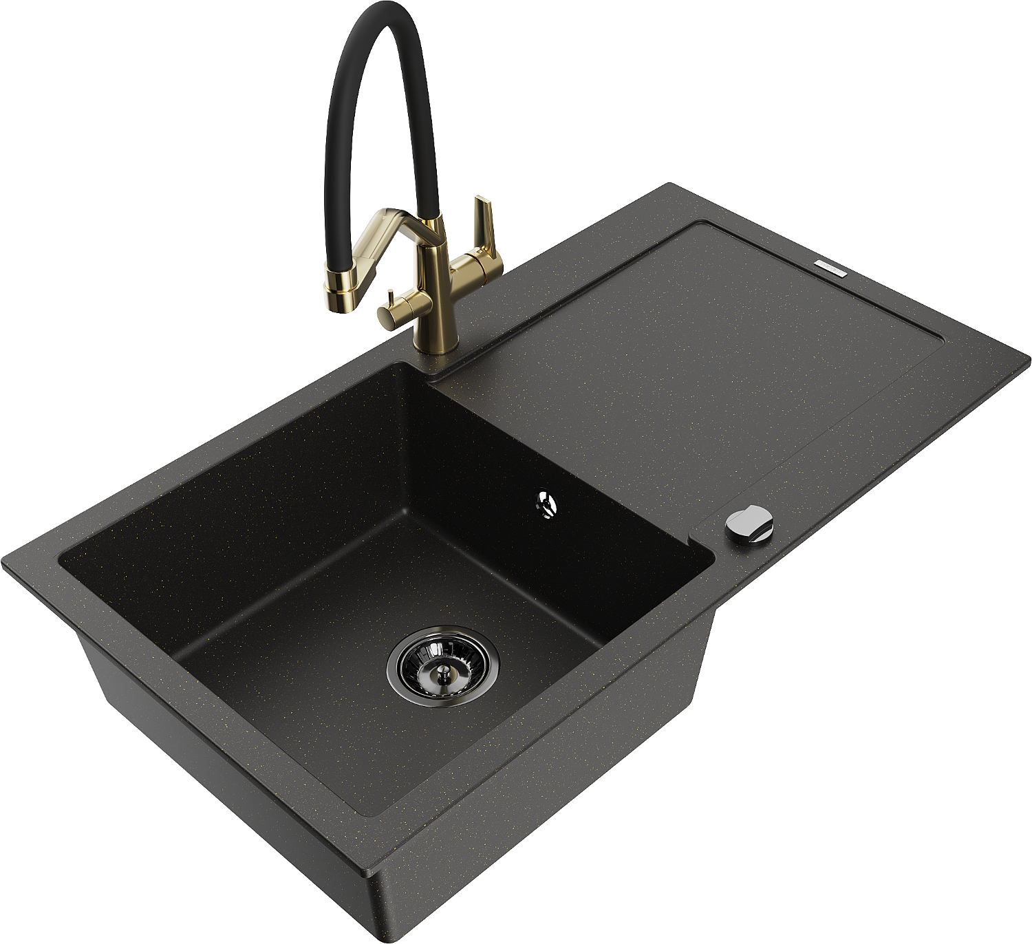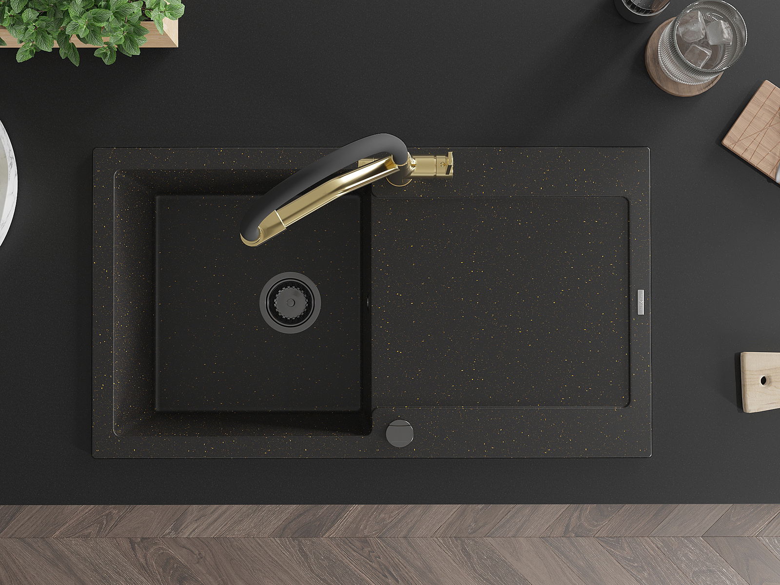 Mexen Leo lavello da cucina in granito 1 vasca con scolapiatti e rubinetto Duo, nero/metallico dorato - 6501-75-671701-57-B