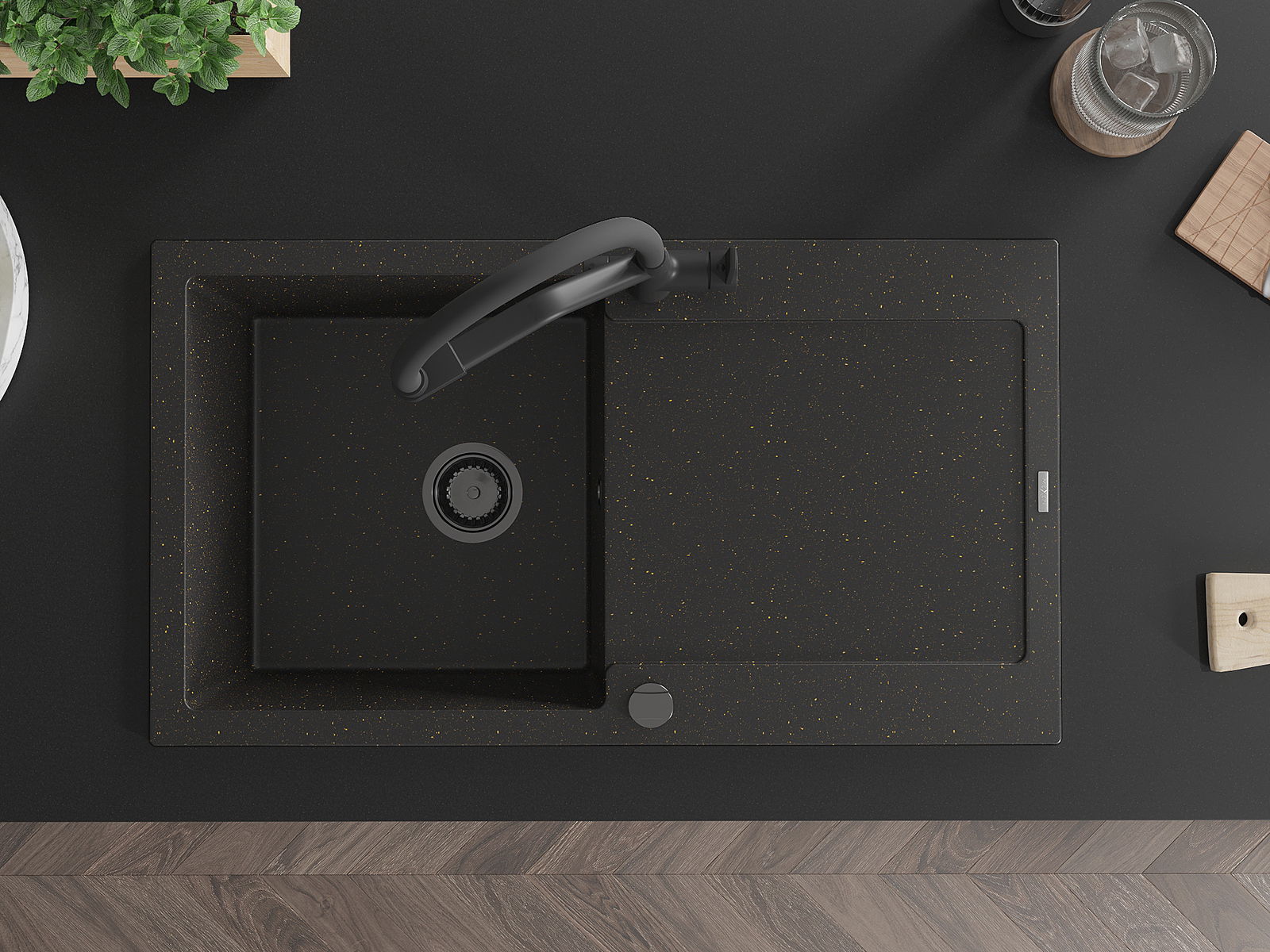 Mexen Leo lavello da cucina in granito a 1 vasca con scolapiatti e miscelatore Duo, nero/oro metallico - 6501-75-671701-70-B