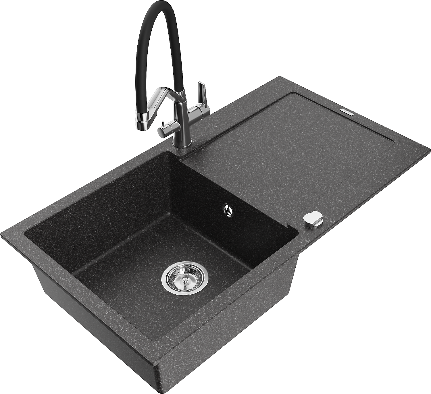 Mexen Leo lavello in granito a 1 vasca con sgocciolatoio e miscelatore da cucina Duo, nero maculato - 6501-76-671701-07