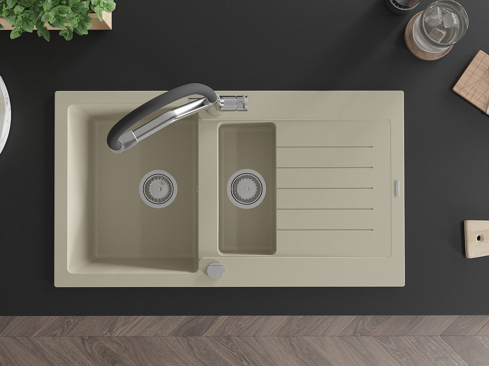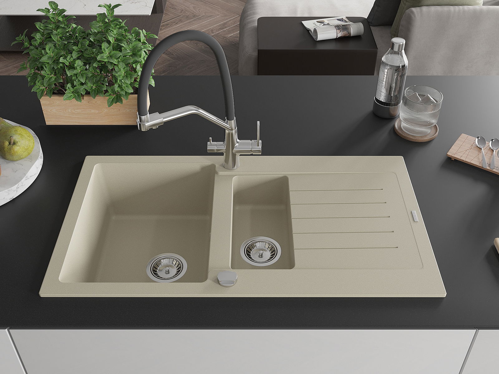 Il lavello è realizzato in granito di alta qualità. Rappresenta un complemento elegante e, soprattutto, pratico per ogni cucina, indipendentemente dal suo stile. L'alta qualità e la durata del granito garantiscono un utilizzo che dura per molti anni.