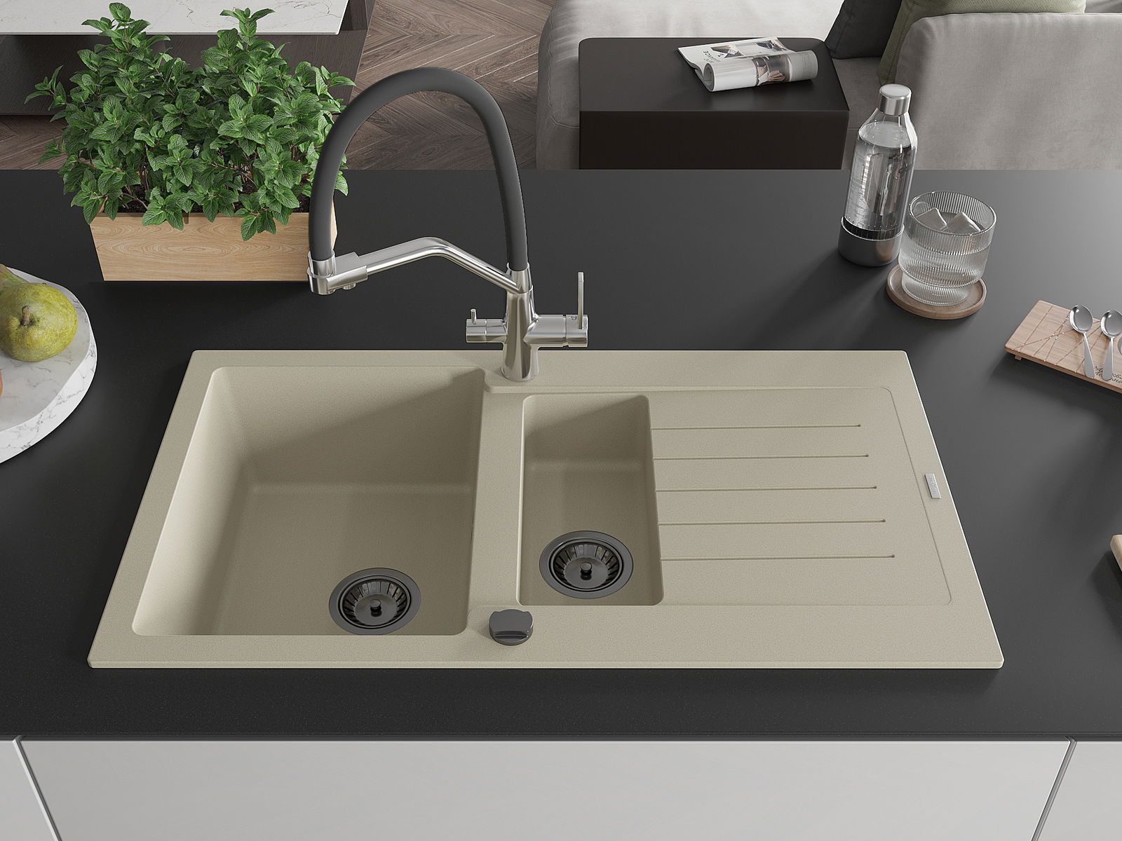 Il lavello è realizzato in granito di alta qualità. Rappresenta un complemento elegante e, soprattutto, pratico per ogni cucina, indipendentemente dal suo stile. L'alta qualità e la durata del granito garantiscono un utilizzo che dura per molti anni.
