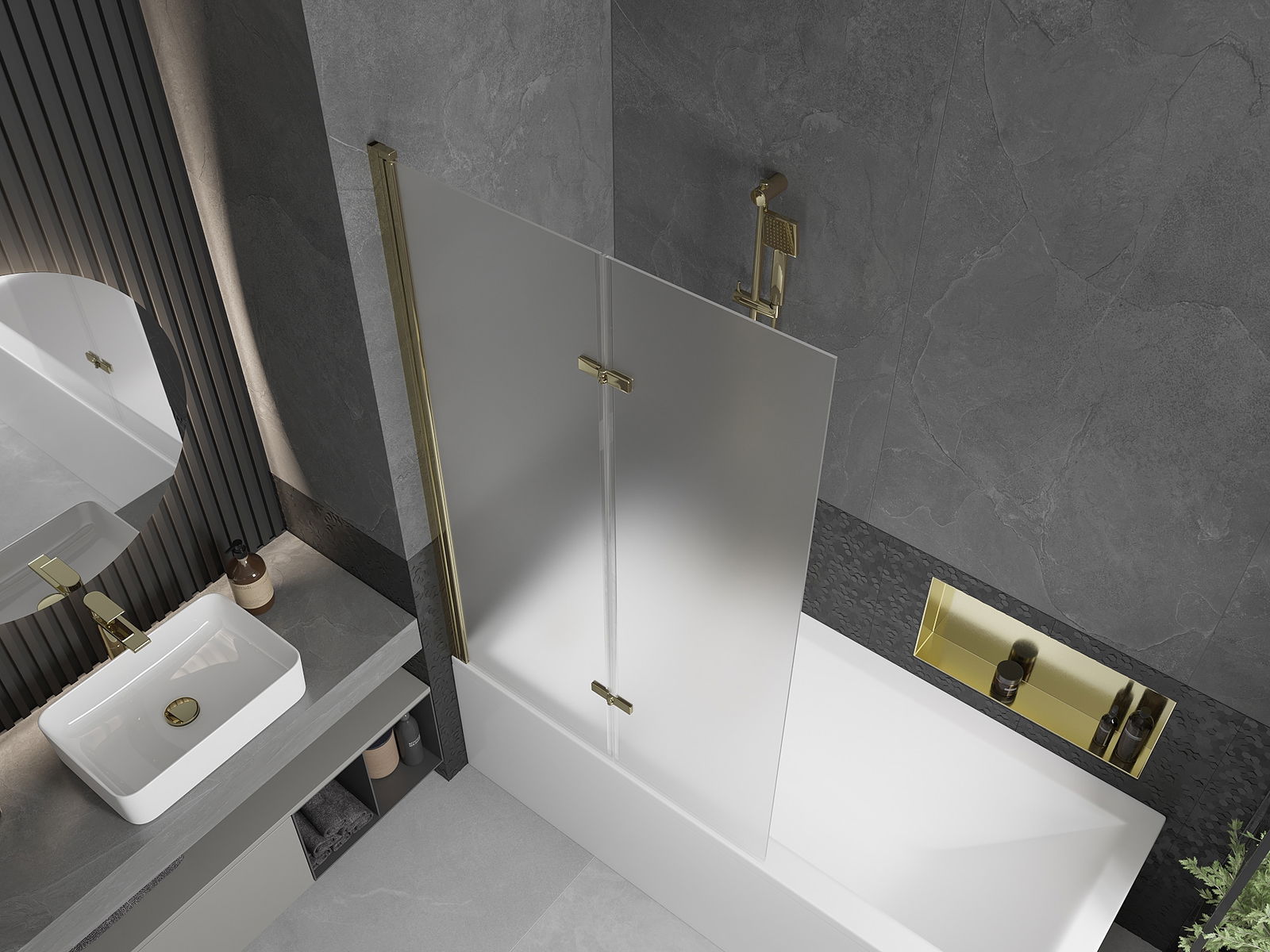 Paravento realizzato con due ante pieghevoli. Questa soluzione consente di risparmiare più spazio nel bagno e permette di utilizzare liberamente l'area restante quando non si utilizza la zona doccia.