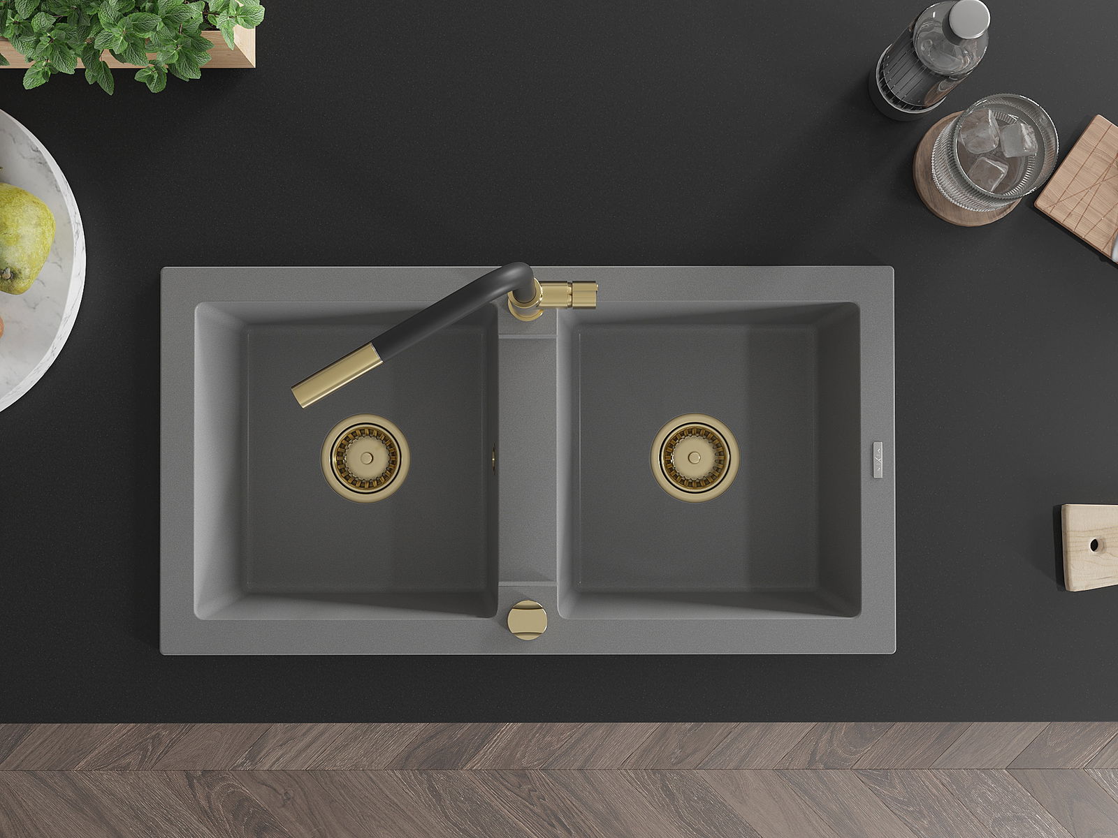 Mexen Mario lavello da cucina in granito a 2 vasche con rubinetto da cucina Flora, grigio - 6504-71-670401-57-G