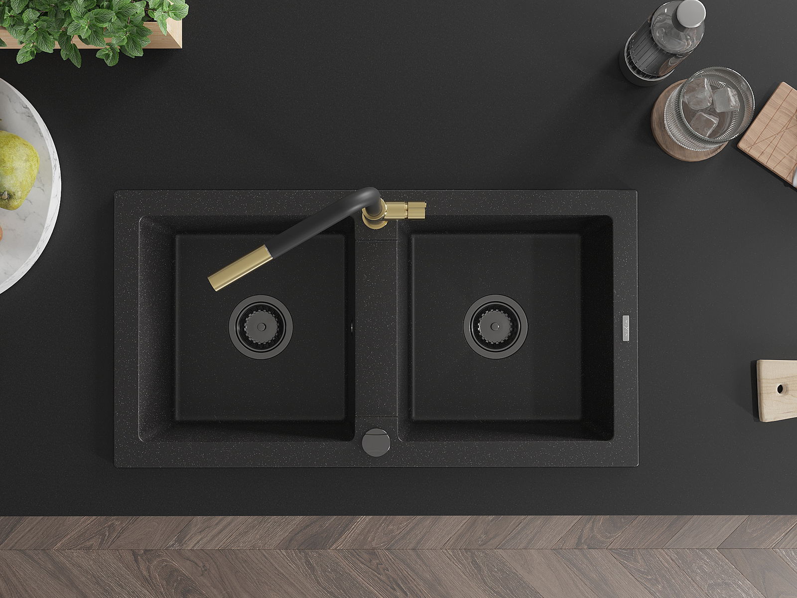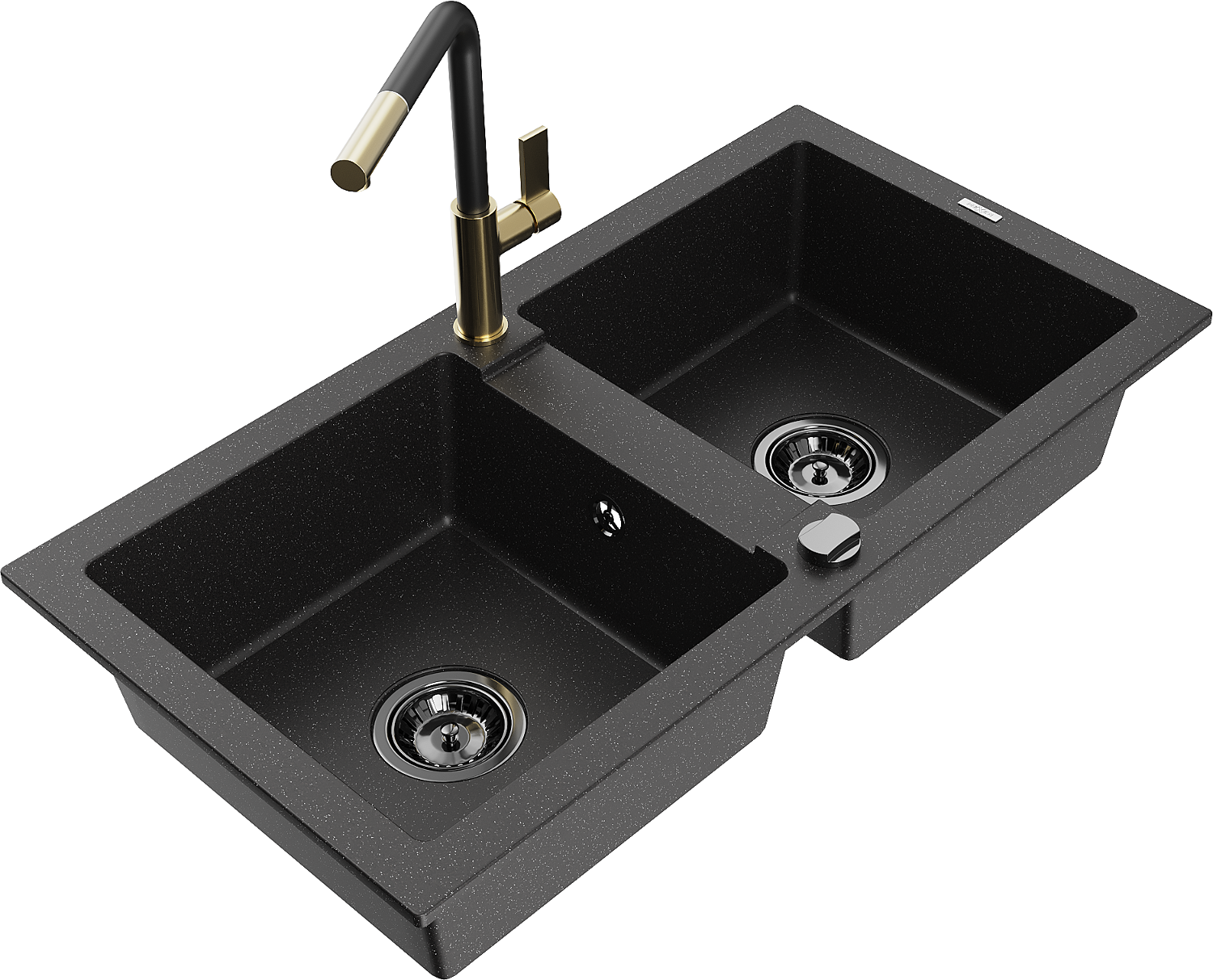 Mexen Mario lavello in granito a 2 vasche con miscelatore Flora, nero/argento metallico - 6504-73-670401-57-B