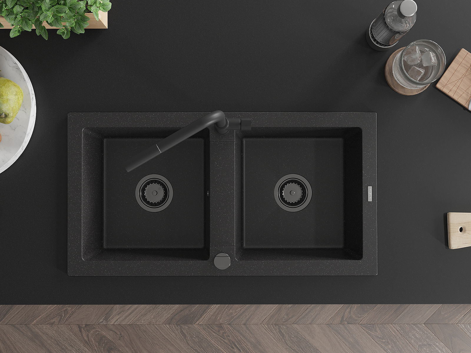 Mexen Mario lavello in granito a 2 vasche con miscelatore cucina Flora, nero/argento metallico - 6504-73-670401-70-B