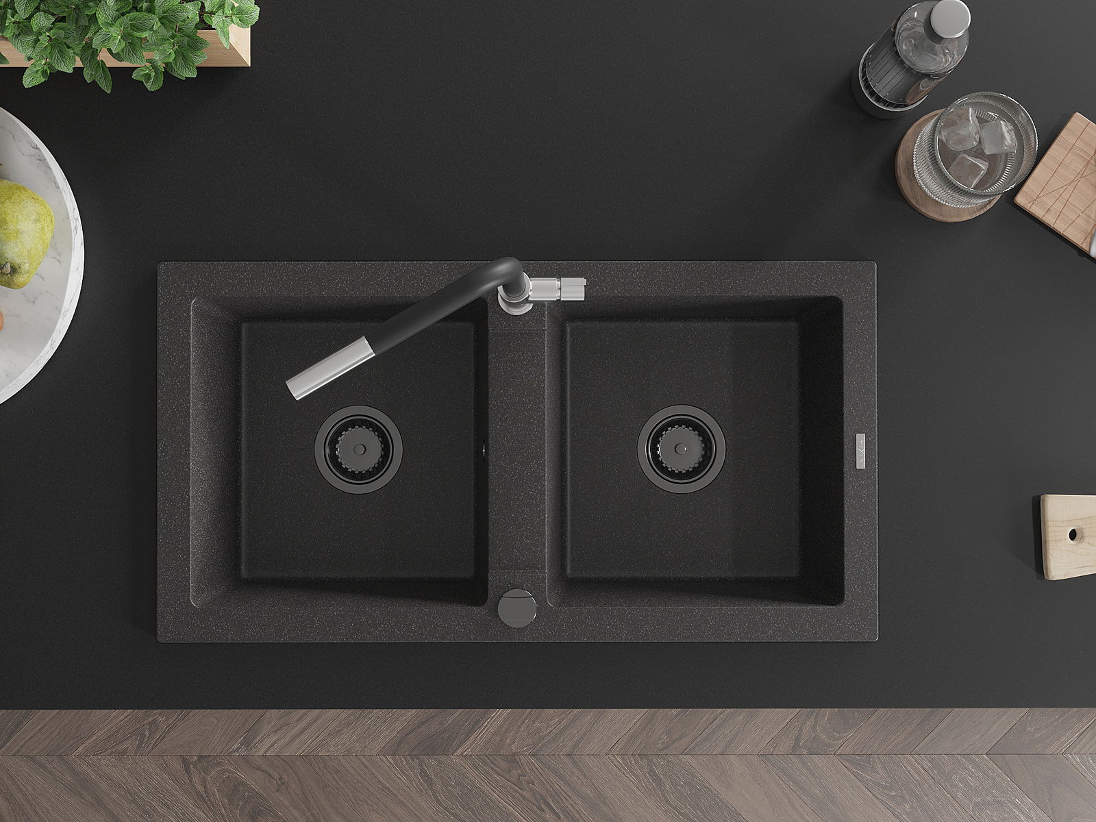 Mexen Mario lavello da cucina in granito a 2 vasche con rubinetto Flora, nero maculato - 6504-76-670401-07-B