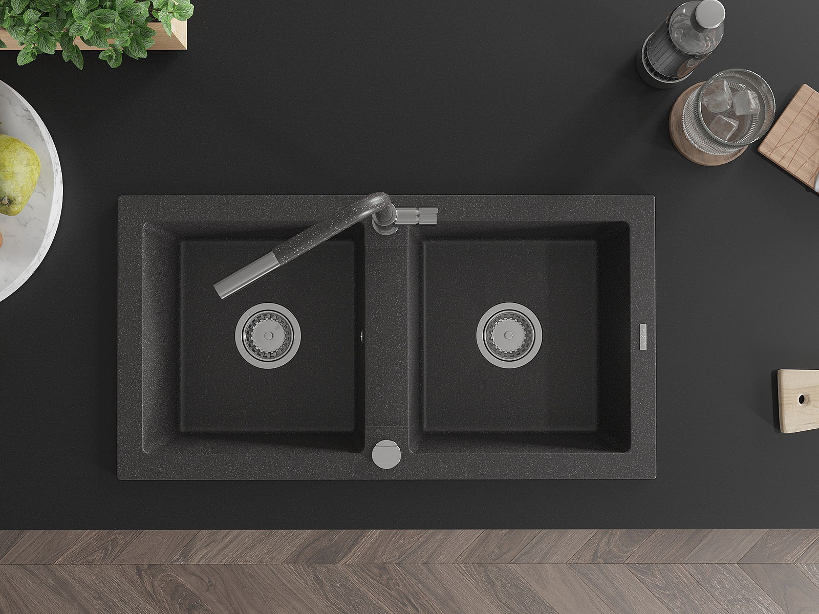 Mexen Mario lavello da cucina in granito a 2 vasche con miscelatore Flora, nero maculato - 6504-76-670401-08