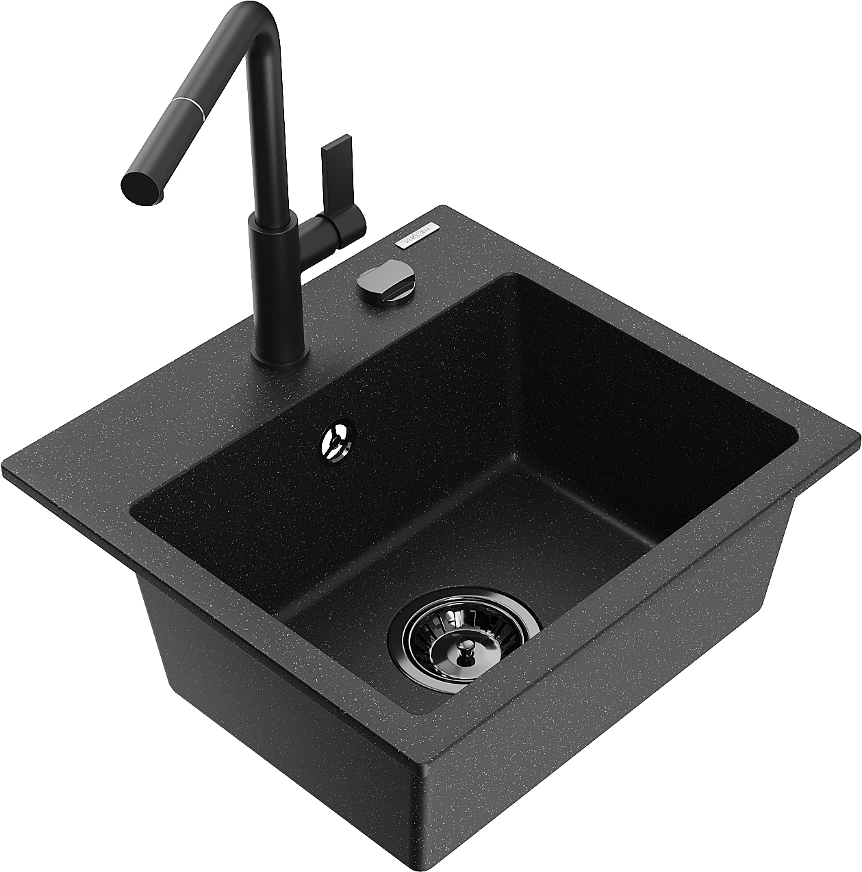 Mexen Milo lavello in granito a 1 vasca con rubinetto da cucina Flora, nero/argento metallizzato - 6505-73-670401-70-B